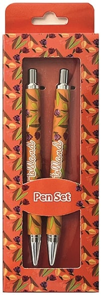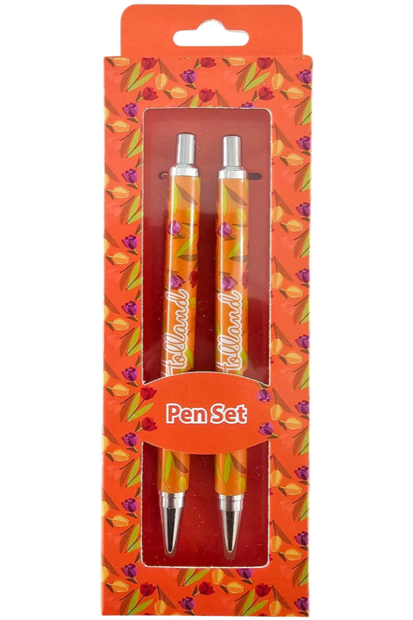 Box containing two beautiful orange ballpoint pens. The pens are decorated with Dutch tulips. Packaged in a beautiful box with the same as pens. Ballpoint pens are always a useful gift for friends, family or colleagues.