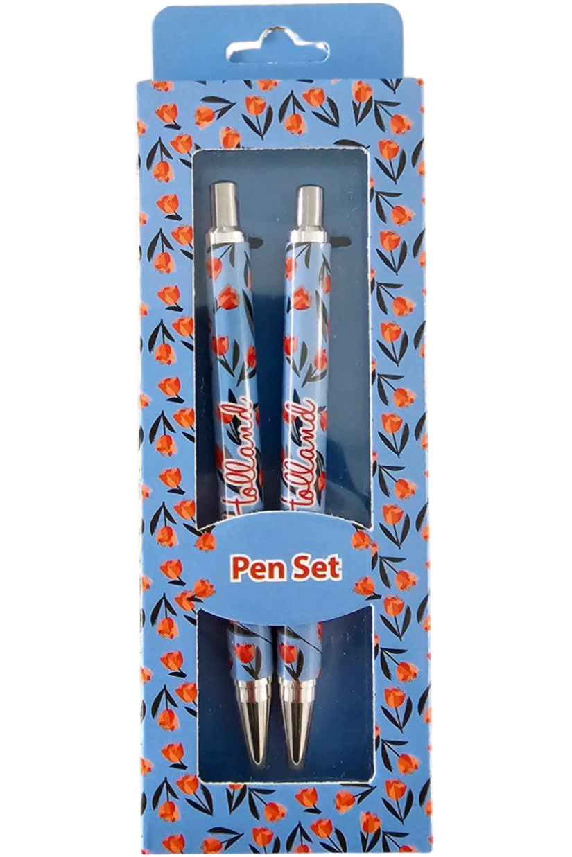 Box containing two beautiful blue ballpoint pens. The pens are decorated with Dutch tulips. Packaged in a beautiful box with the same as pens. Ballpoint pens are always a useful gift for friends, family or colleagues.