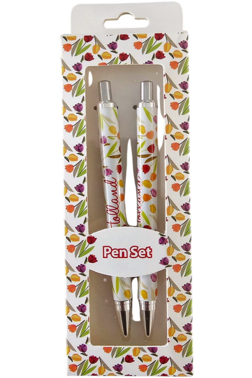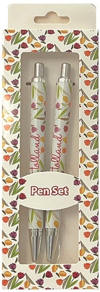 Box containing two beautiful ballpoint pens. The pens are decorated with Dutch tulips. Packaged in a beautiful box with the same as pens. Ballpoint pens are always a useful gift for friends, family or colleagues.