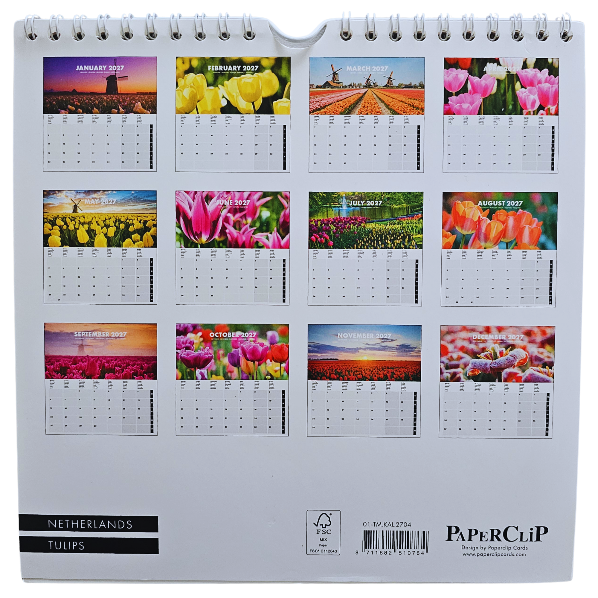 Colorful Wall Calendar 2027 full of Dutch Tulips (20x20 cm). Featuring beautiful photos of tulip fields and windmills. Sturdy spiral binding with hanging loop. Now FREE wrapped in typical Dutch gift paper! The perfect gift for the new year.