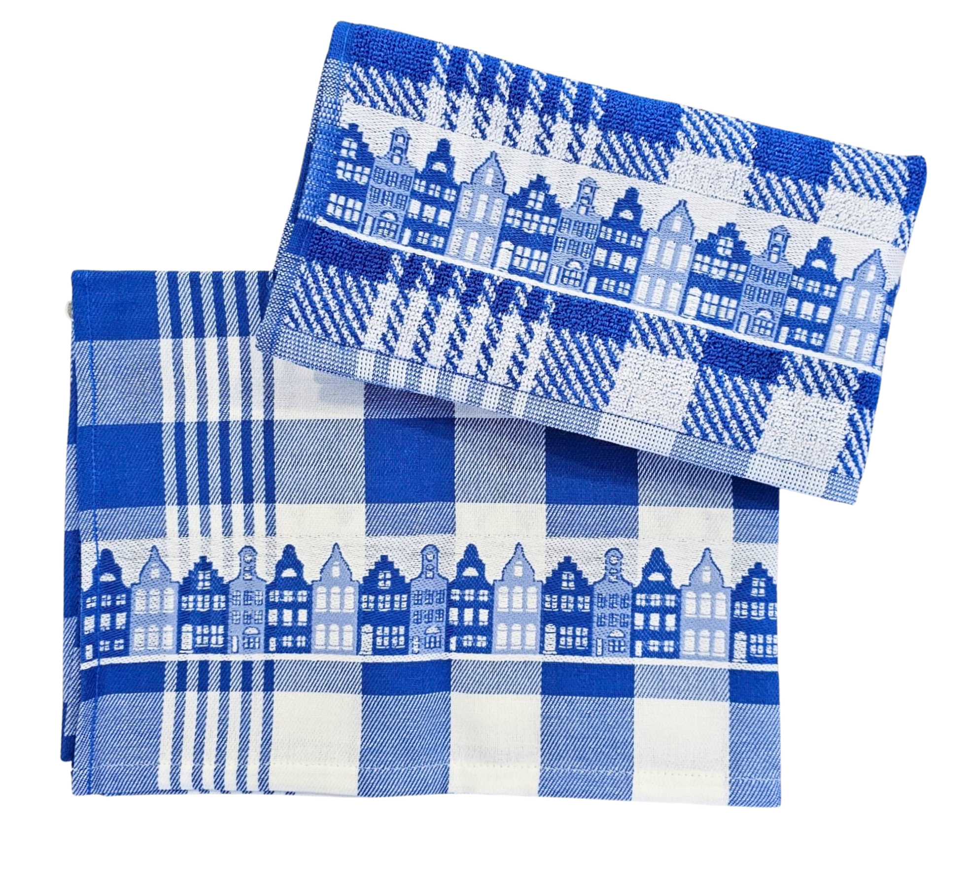 Beautiful kitchen textiles and certainly typically Dutch.What a beautiful design - in blue and white (Facade houses)Towel and tea towel.