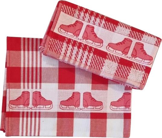 Beautiful kitchen textiles and certainly typically Dutch.What a beautiful design - in red and white skatesTowel and tea towel.