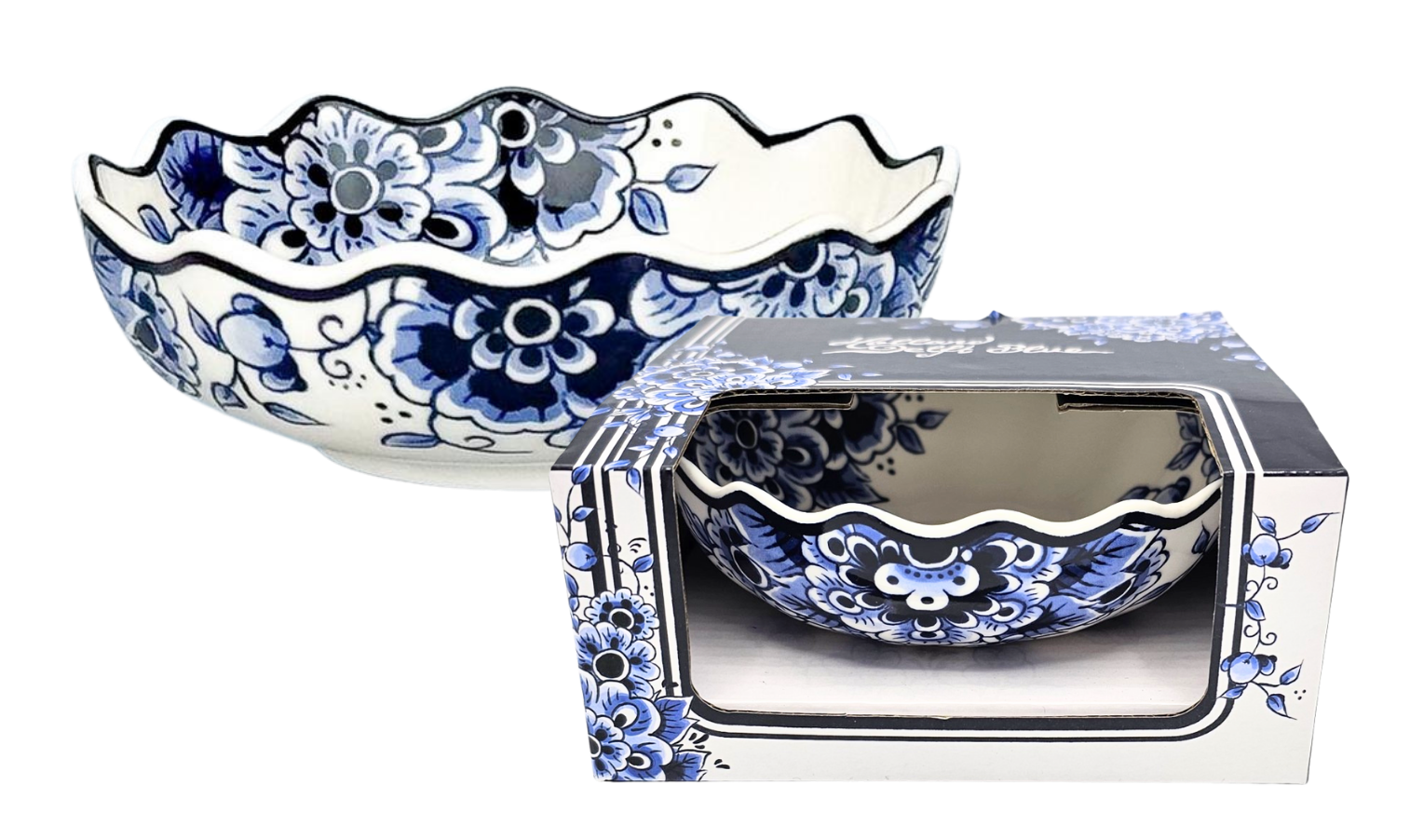 A beautiful Delft blue bowl with an elegant scalloped edge and a classic floral motif on both the inside and outside.