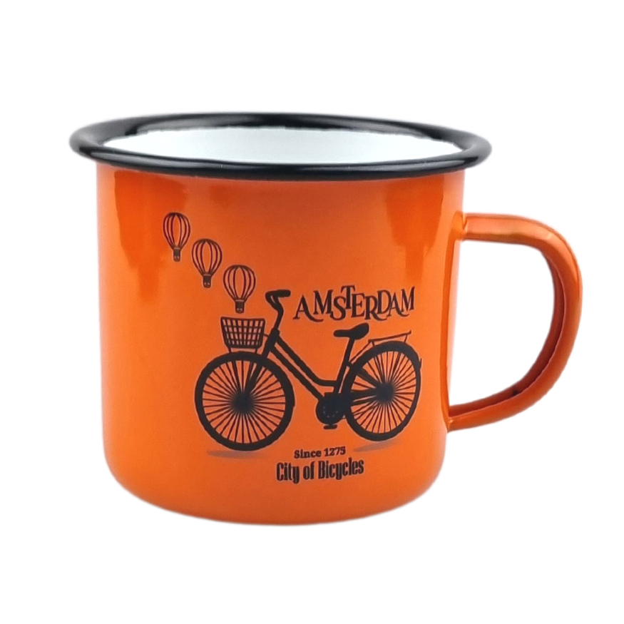 • Typisch Hollands Enamel mug Orange bike and balloons