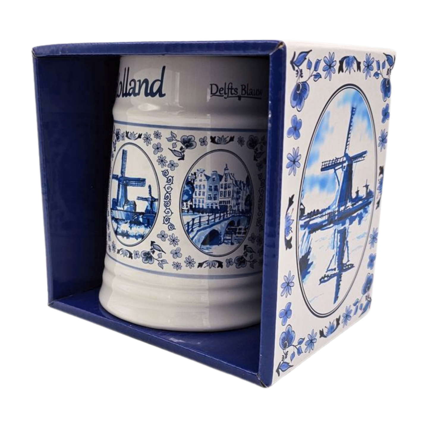 Delft blue beer mug with an image of a Dutch mill landscape.