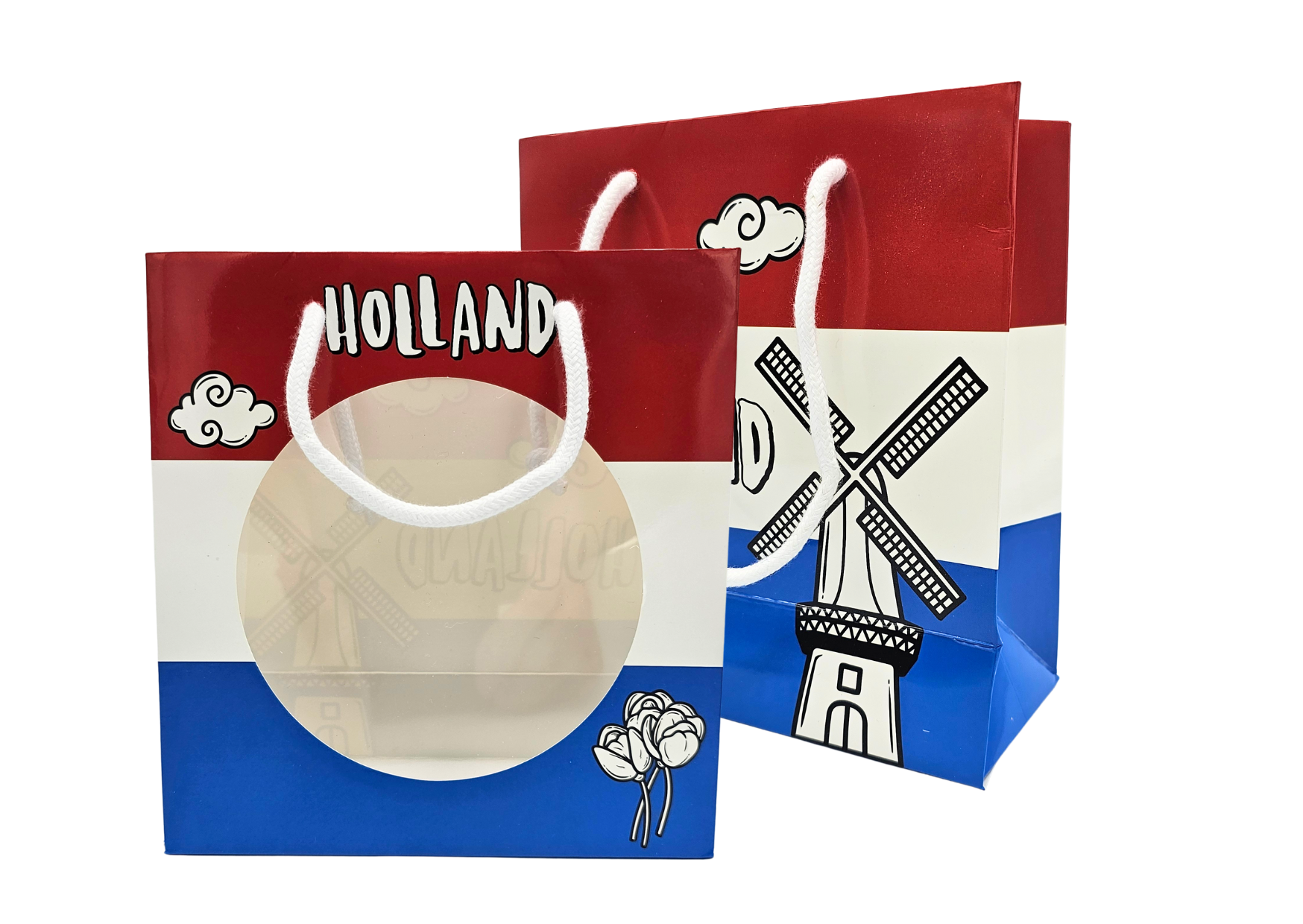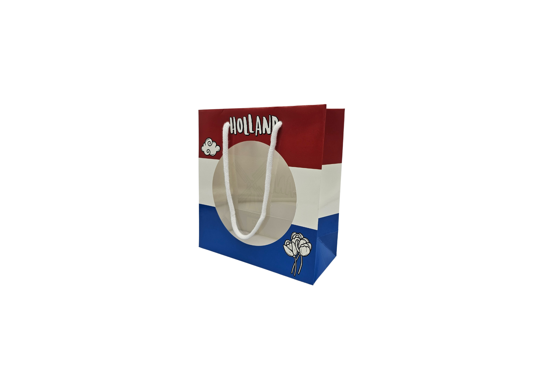 Window bag with coated exterior. With cotton cords. Dimensions: 18+8x19 cm The best alternative to a plastic carrier bag Front a window Back printed with mill