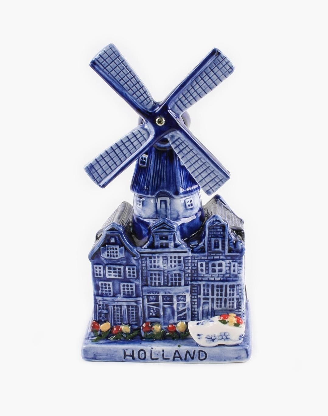 Delft Blue city windmill ♫ with music and wooden shoe with tulips Text: Holland Dimensions: 10x10 Height: 20 CM (plays tulips from Amsterdam)