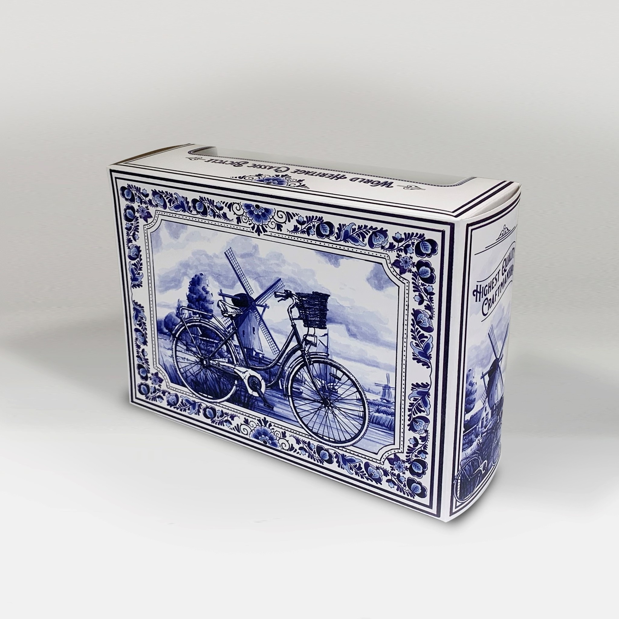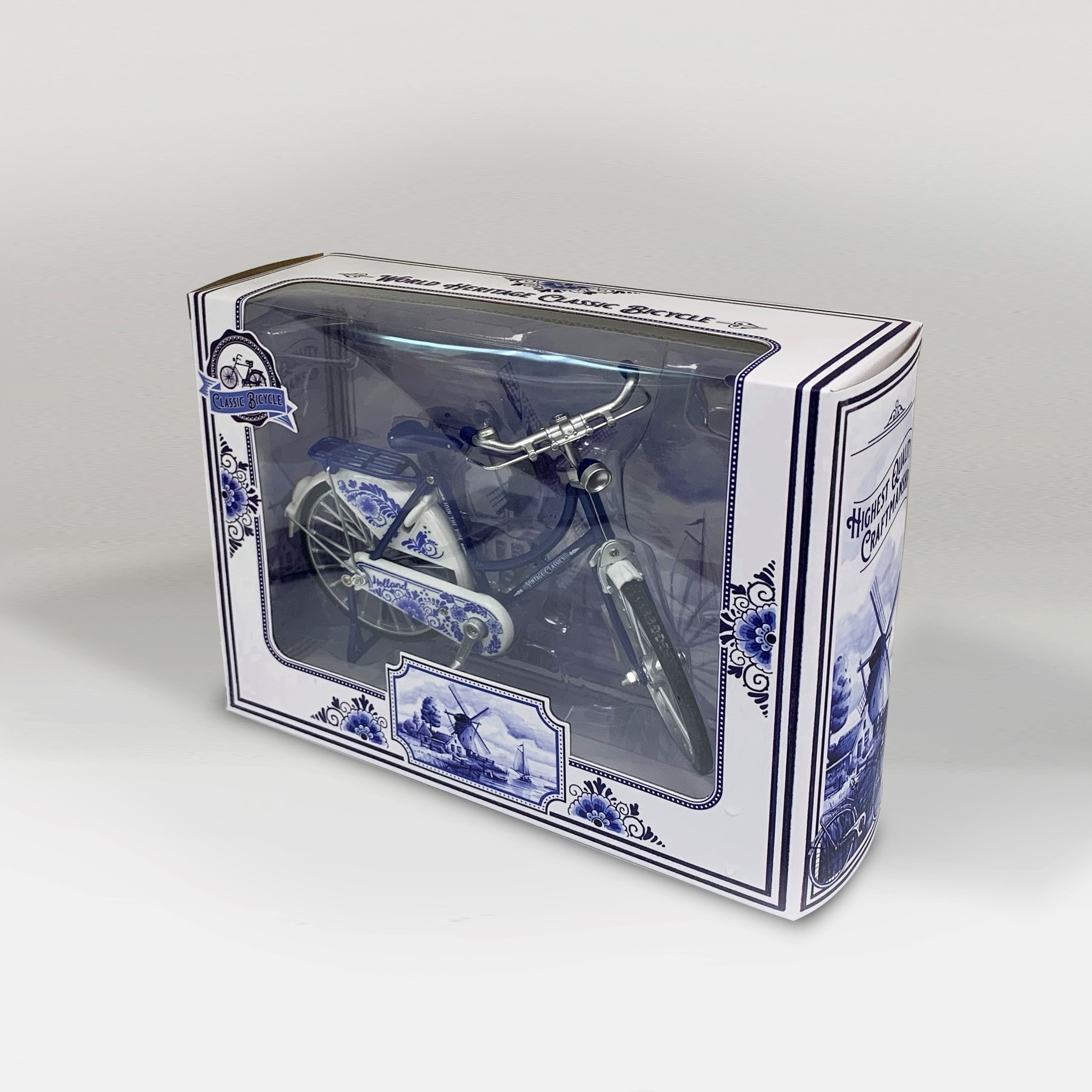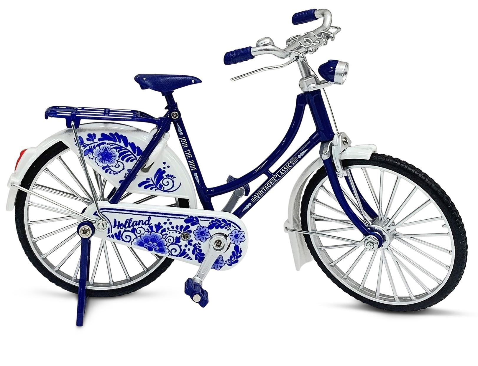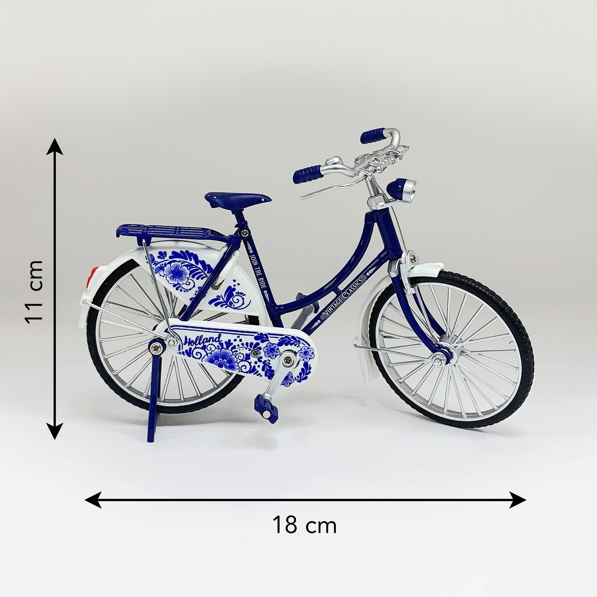 Delft Blue Bicycle Miniature - 18cm Delft Blue Vintage Delft Blue Bicycle - as a decorative item for your interior Highly detailed - includes jacket protector and stand. With pedals that really make the wheel turn Packed in a beautiful gift box Dimensions