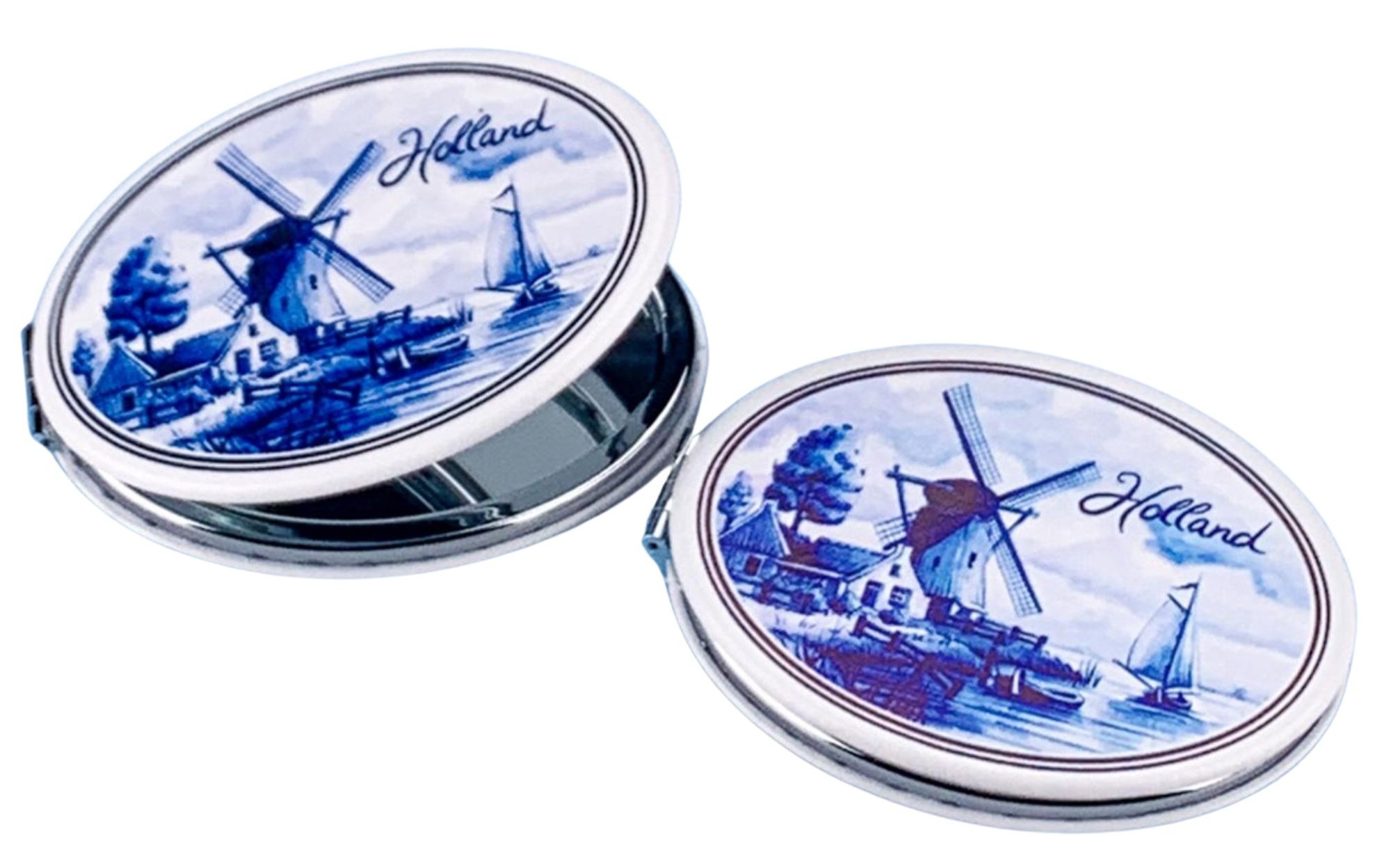 Dutch mirror box in Delft blue design Oval double mirror mirror box with magnetic closure Equipped with a normal and a magnifying mirror Decorated with images of a Dutch mill landscape - on the water.