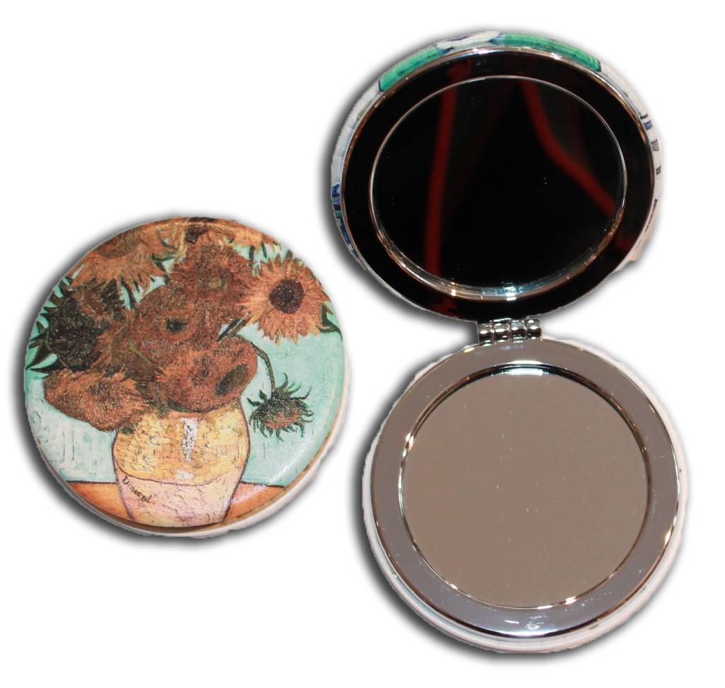 Mirror box - Round - Sunflowers Round duo-mirror | Mirror box with magnetic closure With a normal and a magnifying mirror Dimensions: 6 cm (so it always fits in every bag) Vincent van Gogh's Sunflowers
