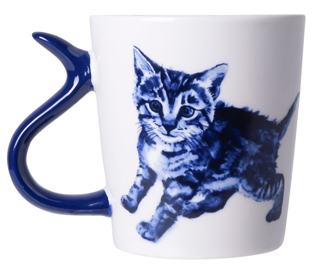 A cute coffee - tea mug for cat lovers. The white porcelain mug features a Delft blue cat looking at you sweetly.