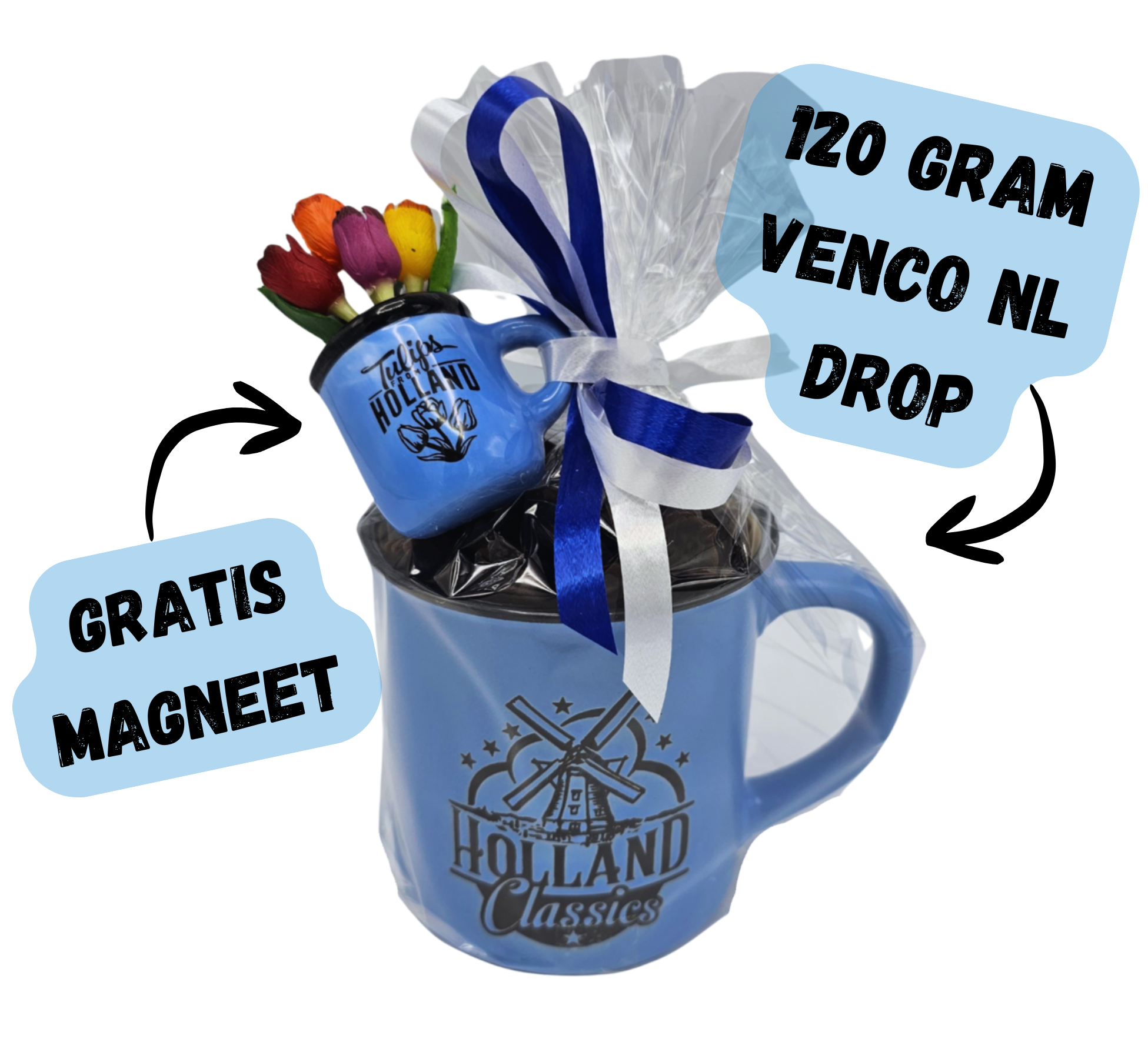 Blue mug with liquorice filled with sweet liquorice. Blue mug filled with sweet liquorice and FREE magnet, contains 120 grams of Dutch liquorice, wrapped in foil to a fun gift.