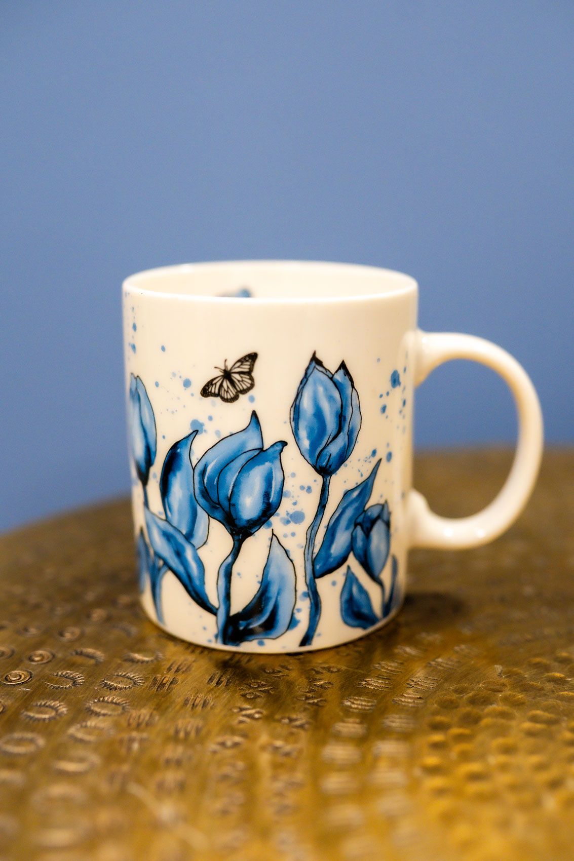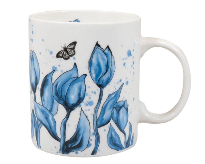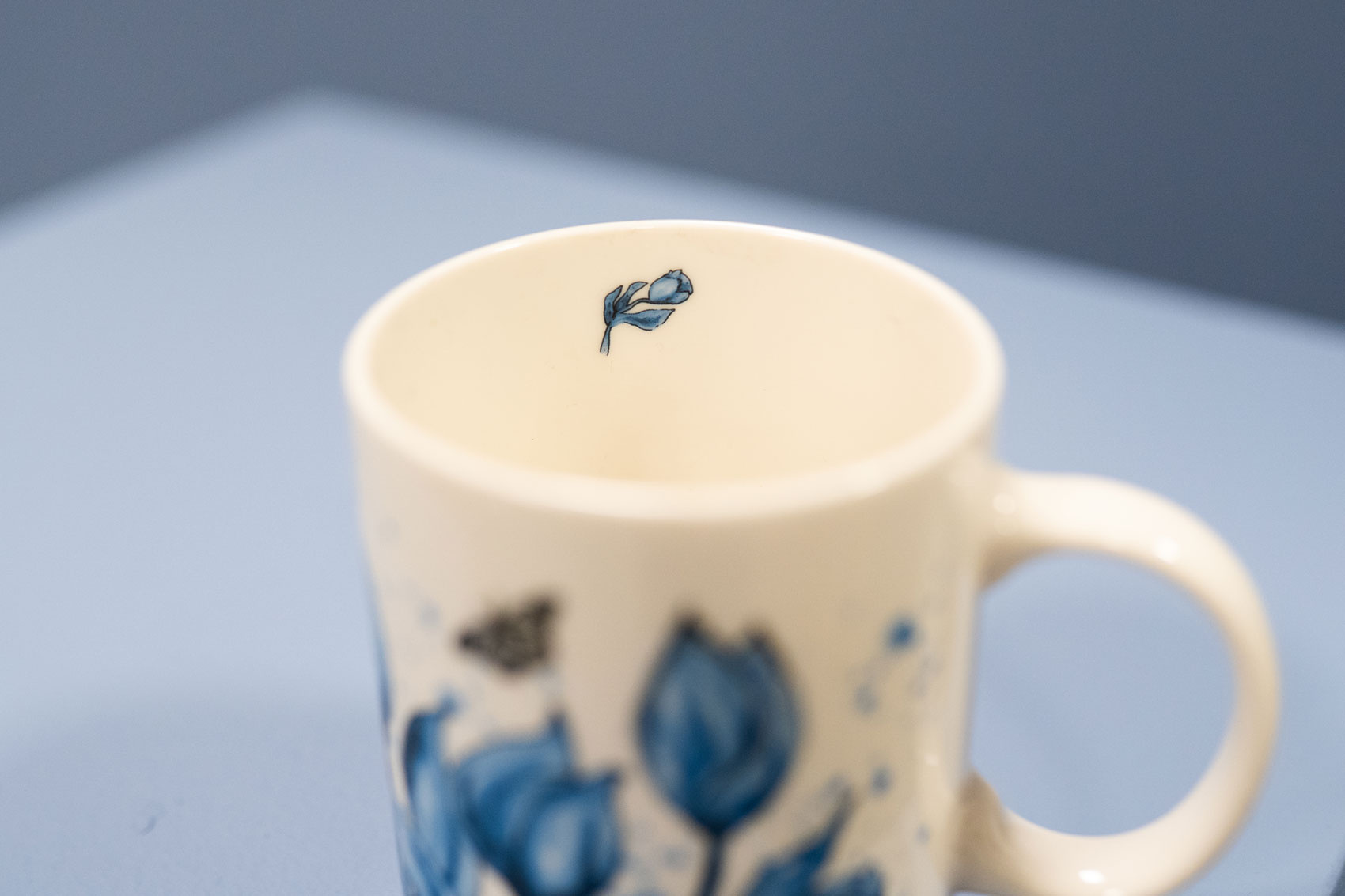 The cup is made of ceramic and has a subtle relief with an expressive tulip print,