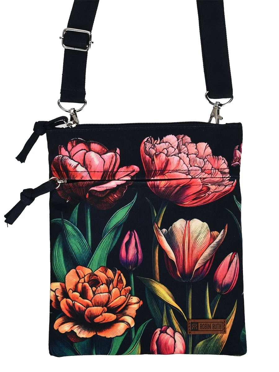 Passport bag - Neck bag - Black with botanical tulip print This bag has two compartments with zipper and adjustable shoulder strap. Super suitable during your trip for money and travel documents. •Material: Cotton. •Dimensions: 16 x 20 cm.