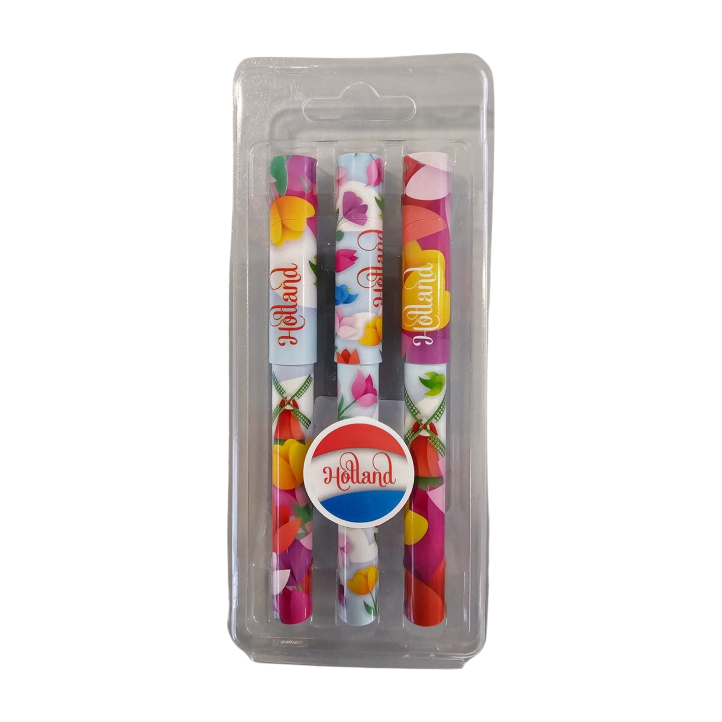 Pen set 3-piece - Tulips and windmills Holland Contents 3 pieces Pen with Cap Fine writing, with replaceable content. Printing: Tulips Delivered in a blister.