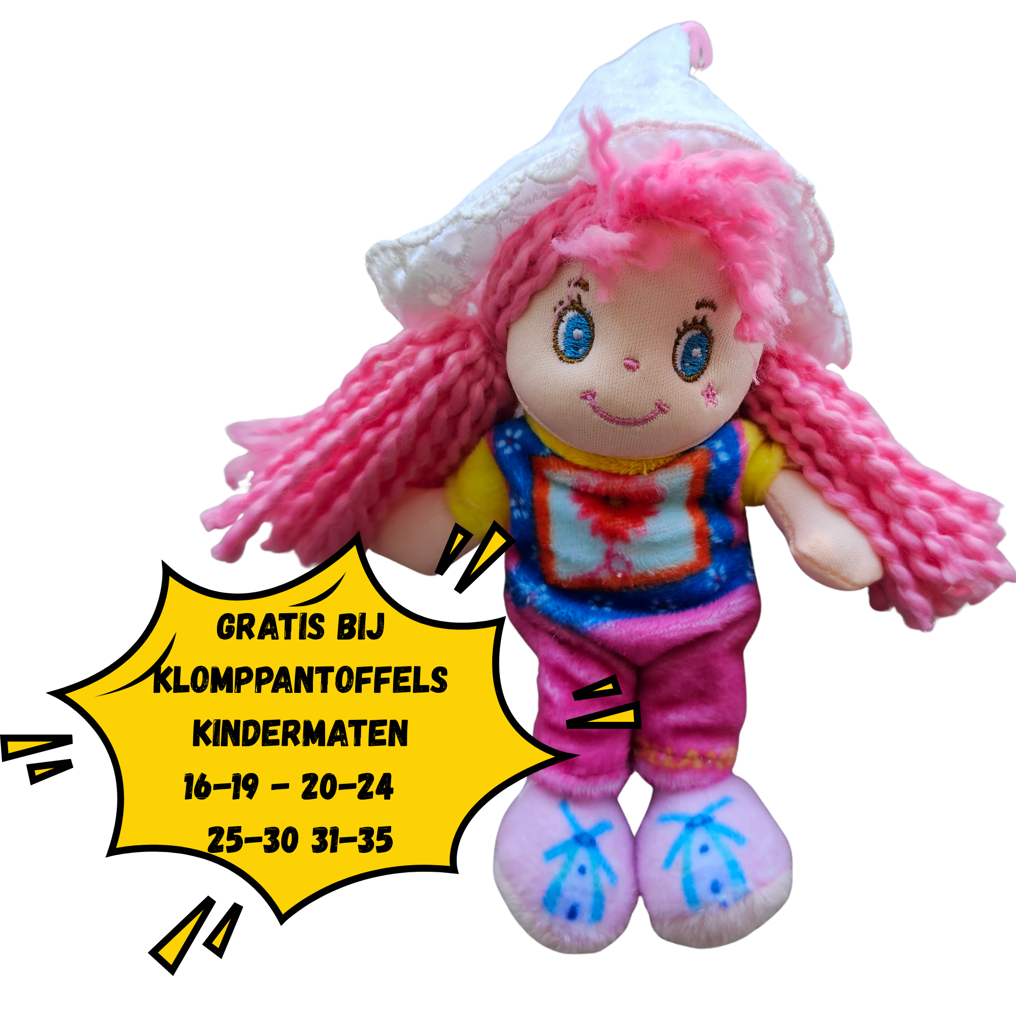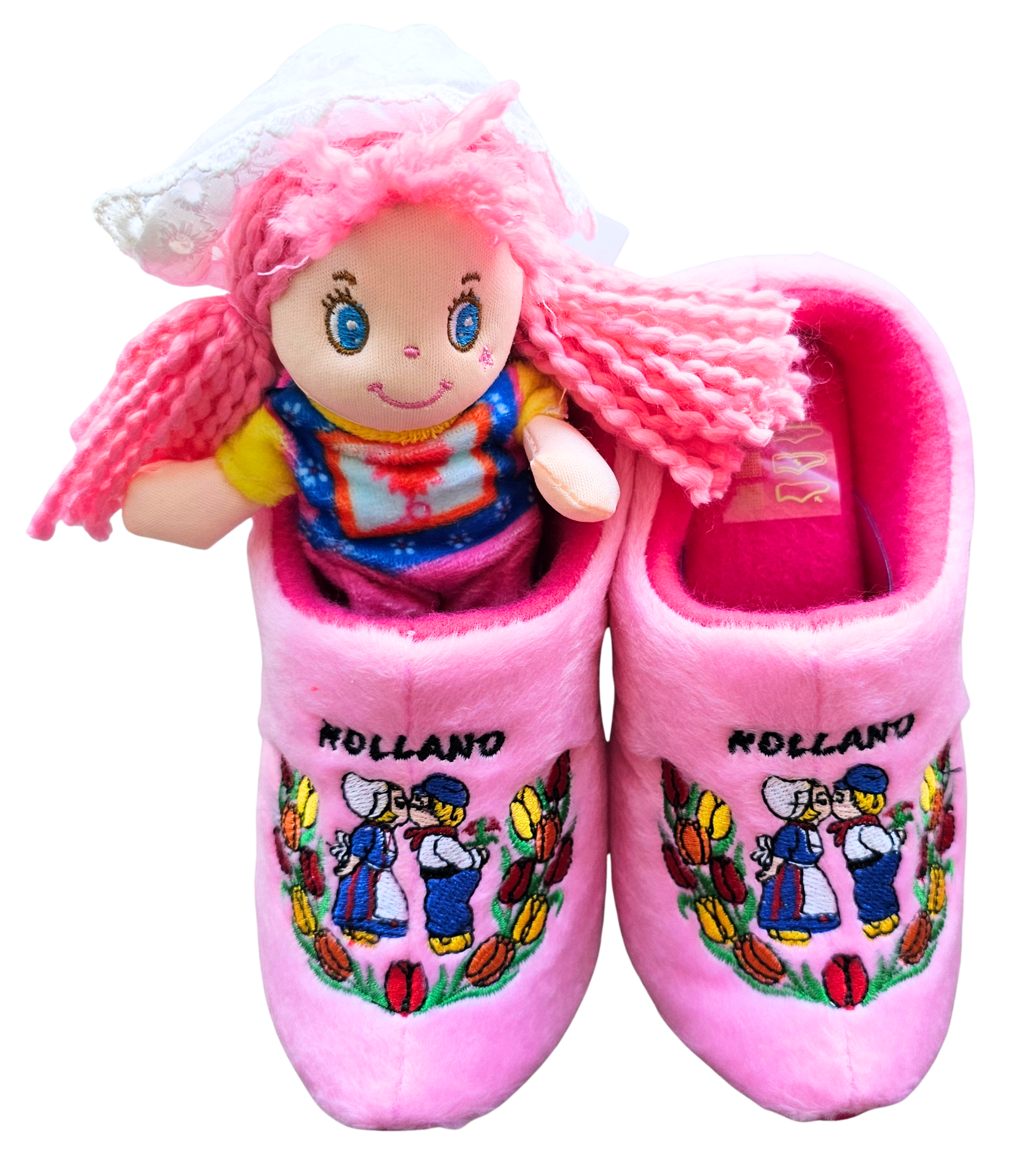 Keep little feet warm with the pink clog slippers from Typisch Hollands! These soft plush clogs with a kissing pair have a safe non-slip sole. Now temporarily includes a FREE cuddly doll with children's sizes. The perfect Dutch baby gift from size 0-6 mon