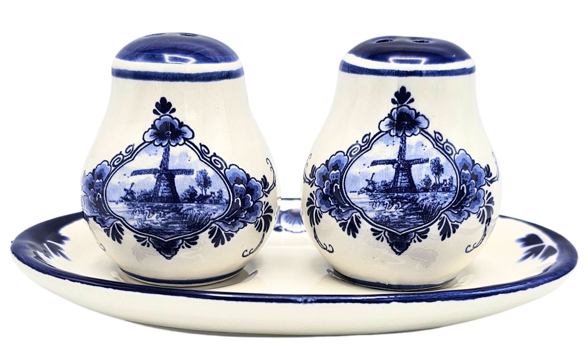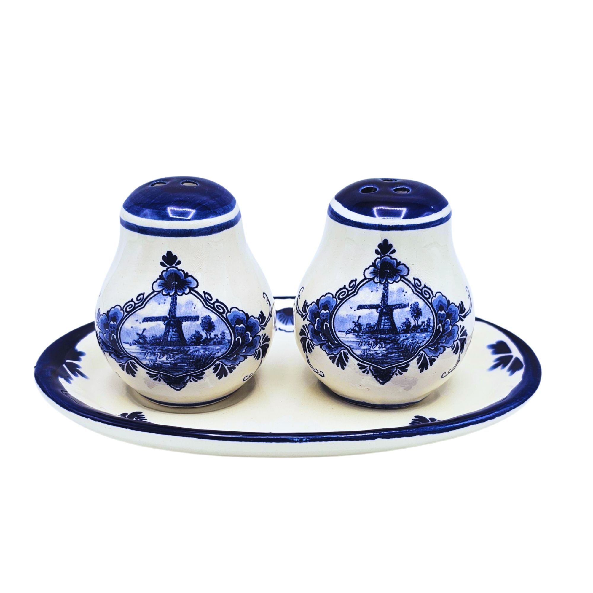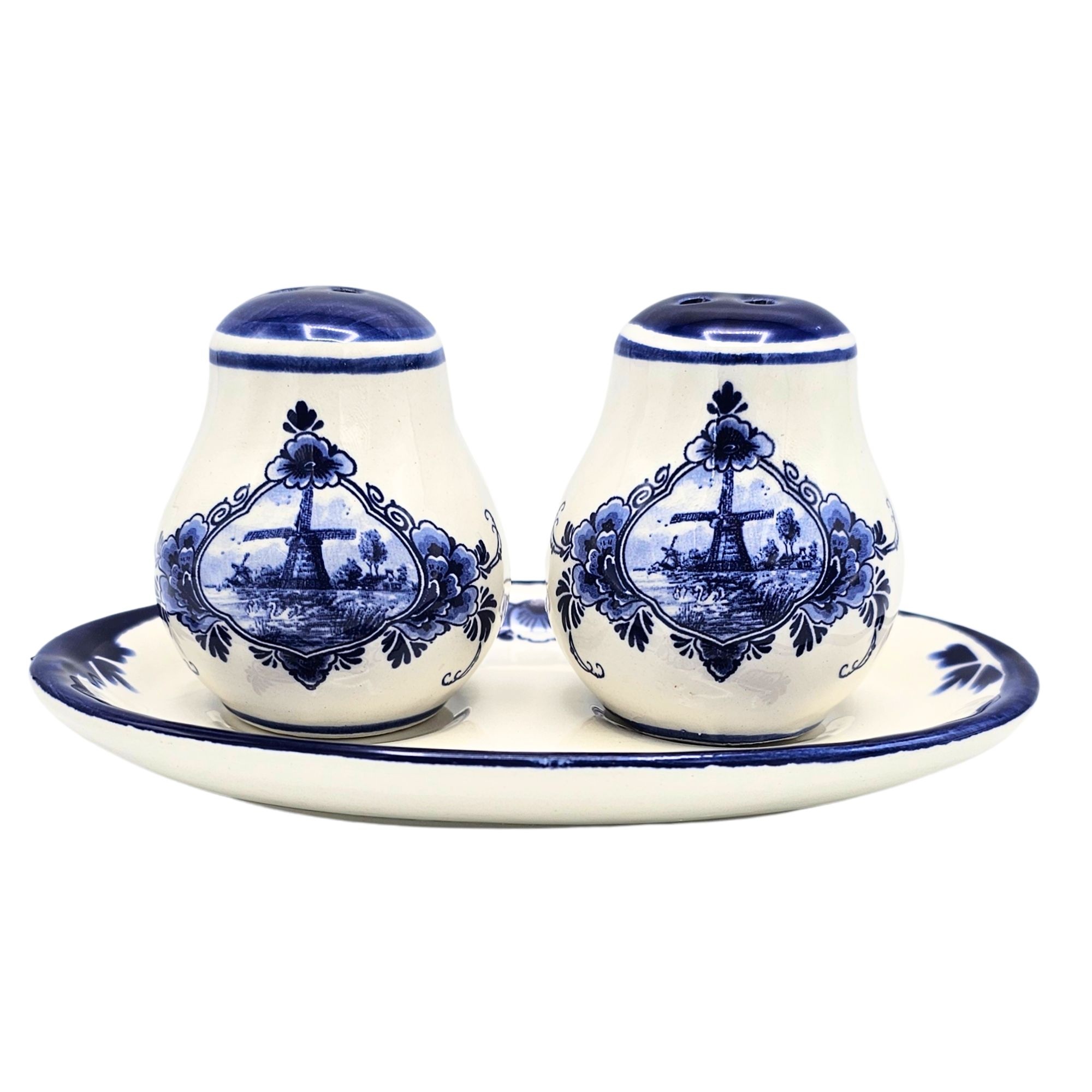 Bring the Dutch atmosphere to the dining table with this Delft blue salt and pepper set on a handy tray. Beautifully decorated with a classic Dutch windmill landscape. A functional and decorative souvenir made of high-quality ceramic.