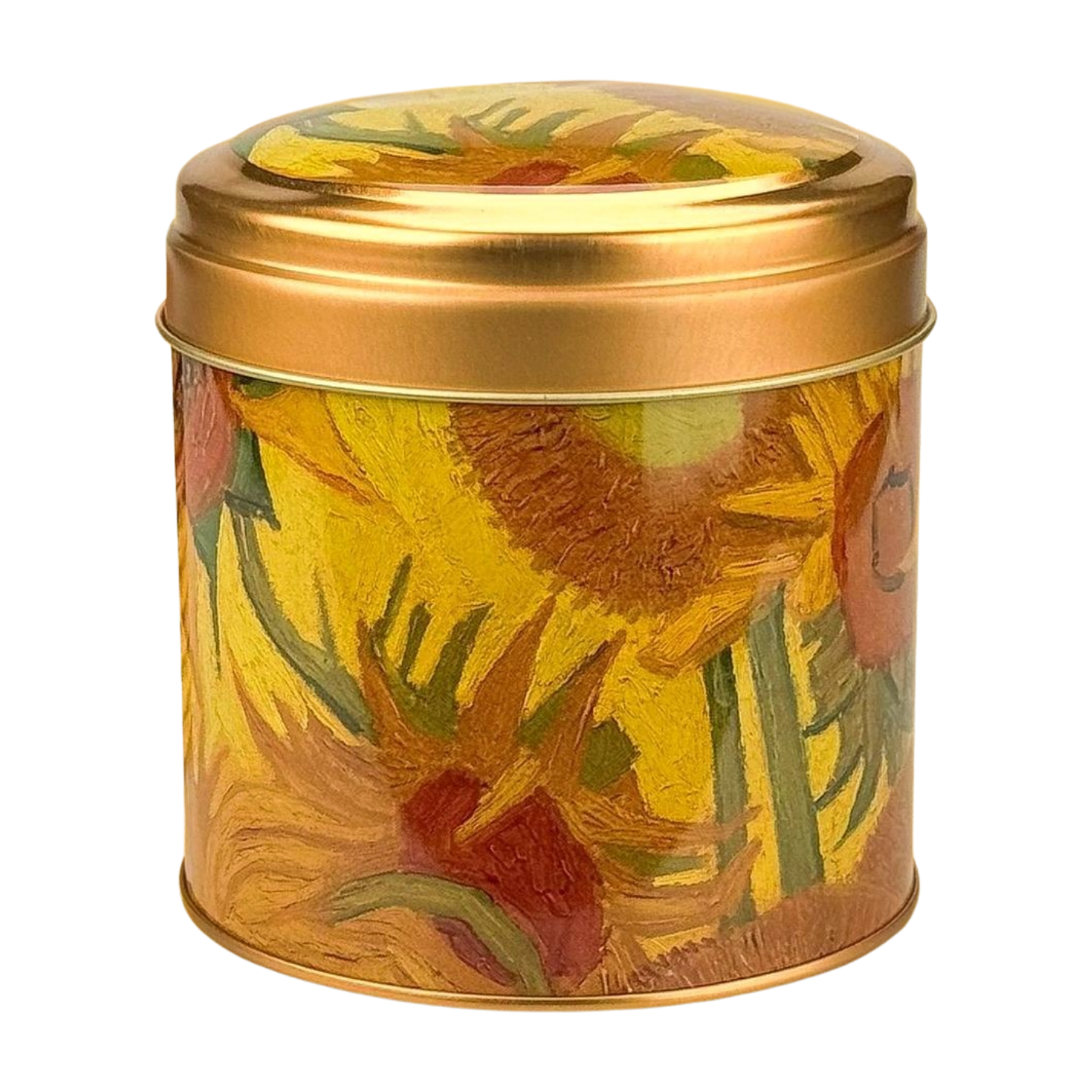 Bring a masterpiece home with this empty souvenir tin, decorated with Vincent van Gogh's famous Sunflowers. Ideal for collectors or for filling with treats yourself. Conveniently stackable thanks to the hollow base and domed lid. Dimensions: 11x10x10 cm.