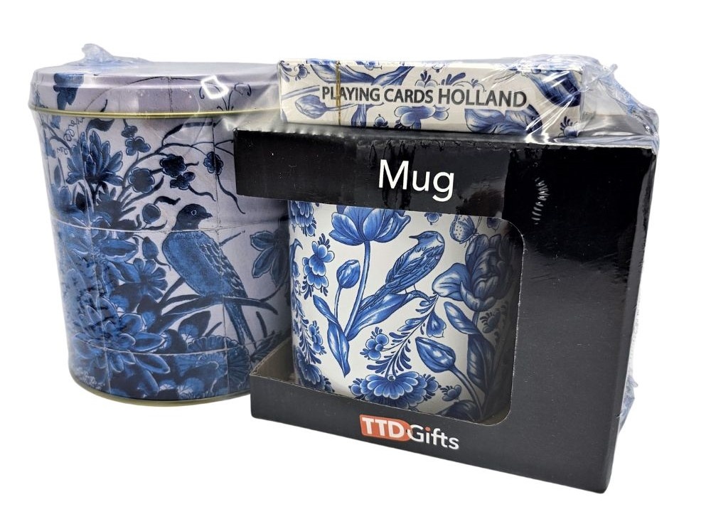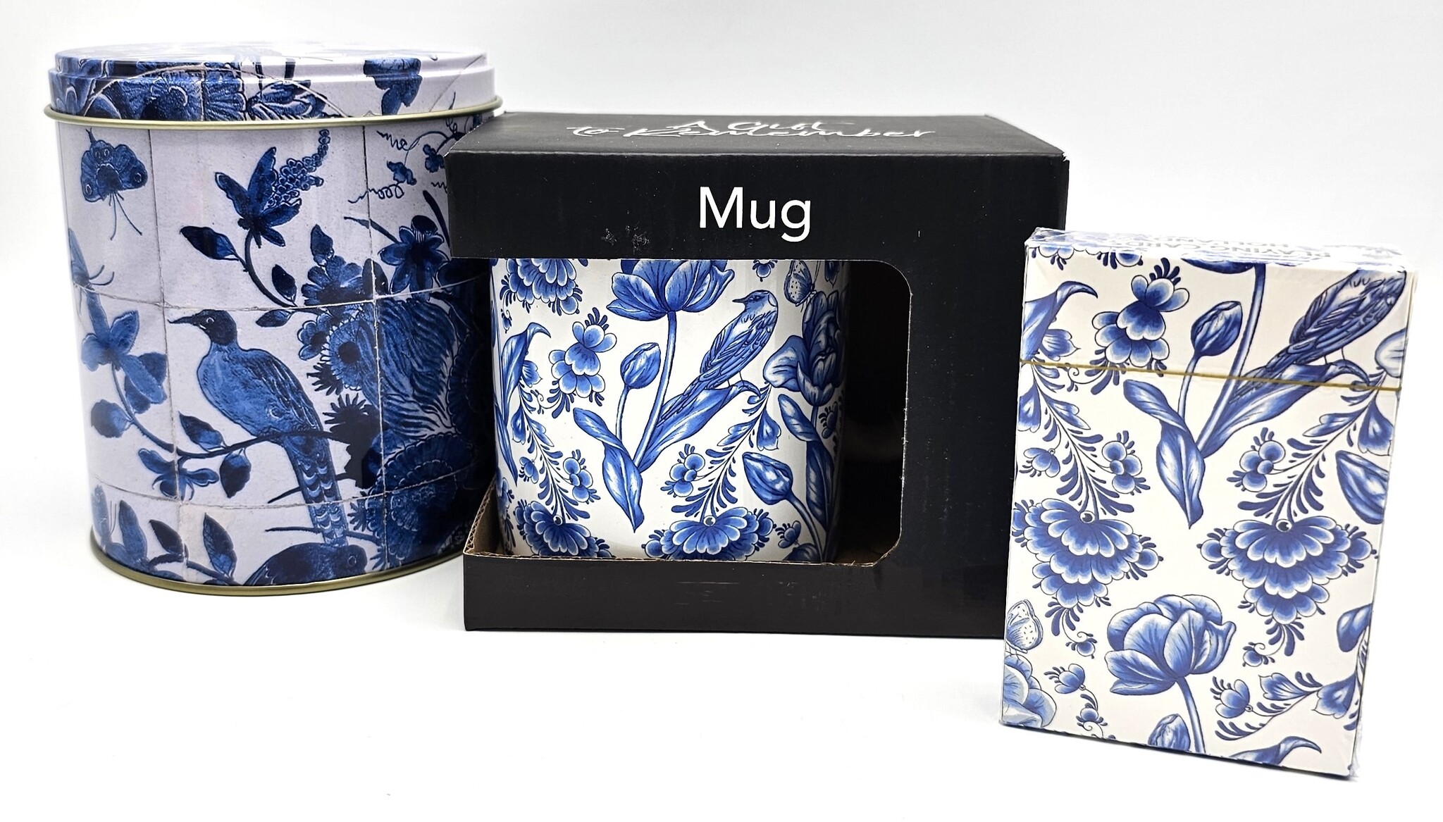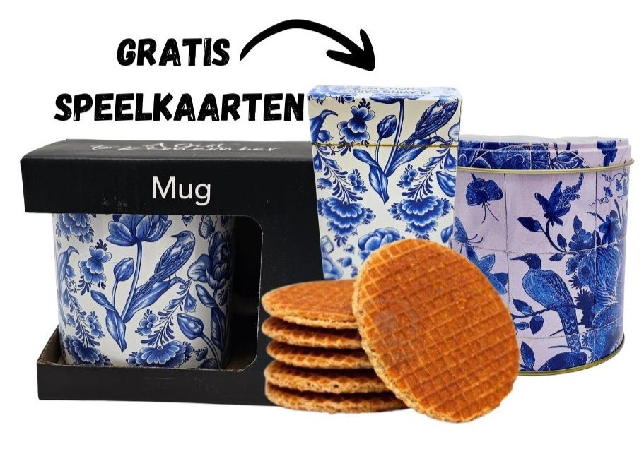 Stroopwafels in a tin & mug with Delft blue flowers and birds8 fresh stroopwafels in a sealable bag.