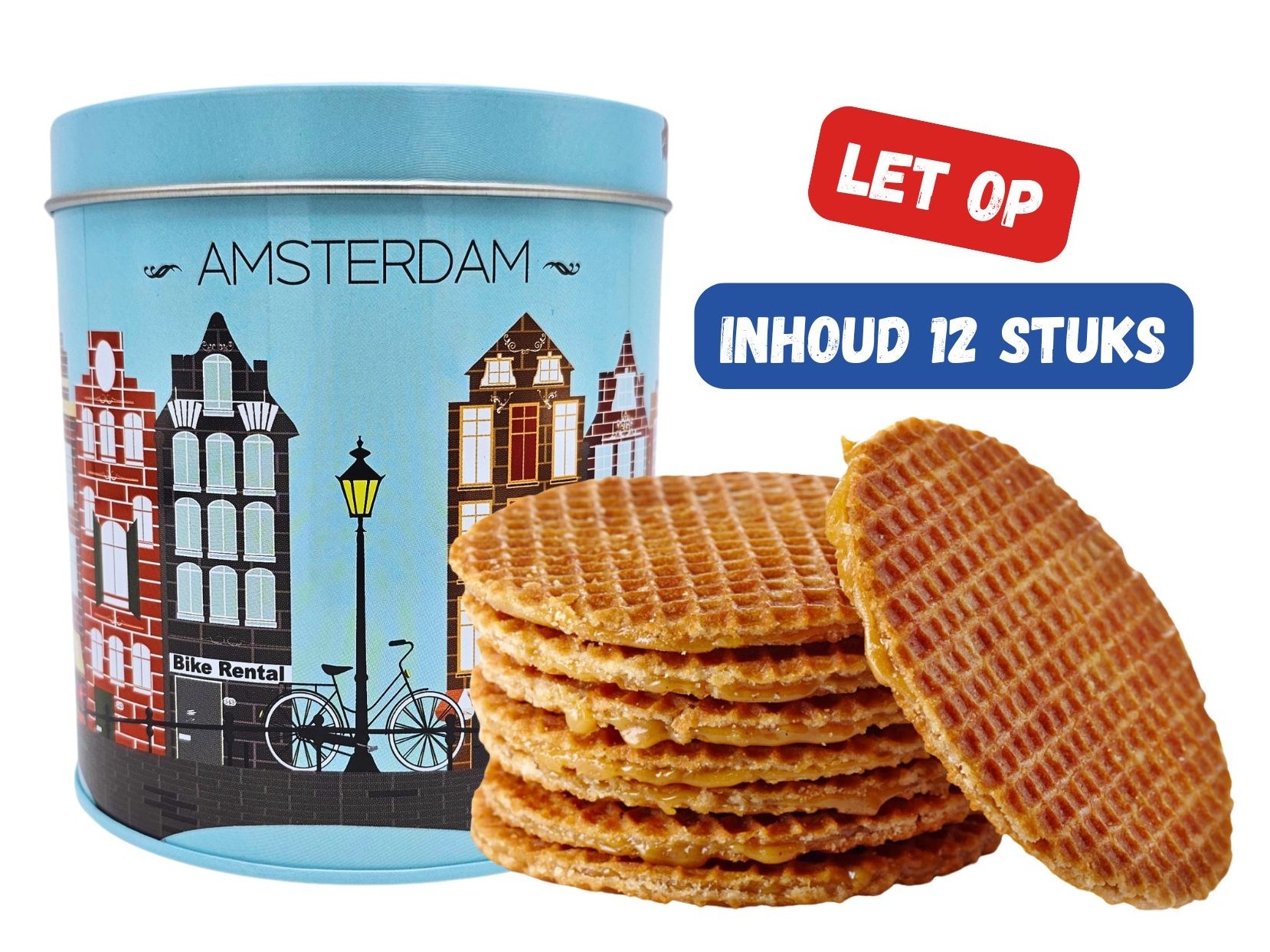 Stroopwafels in a tin with stylish tulip decoration Dimensions: 110 x 100 x 100 mm Material: Metal Contents: 8 stroopwafels