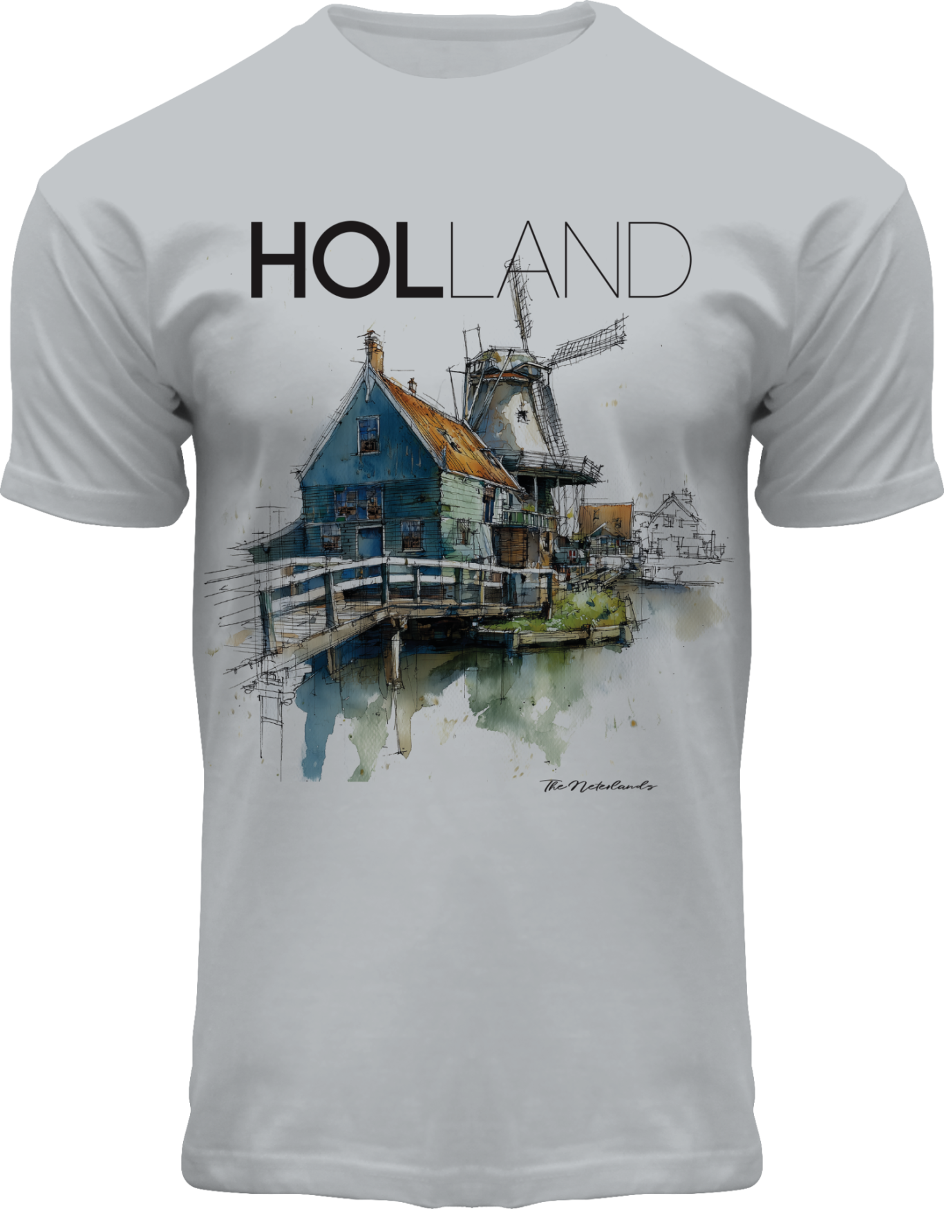 This shirt combines a stylish, artistic print of iconic windmills.