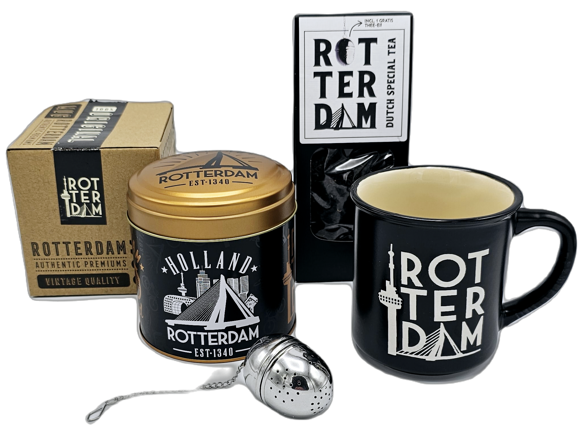 Sturdy mug-Erasmus Bridge - Euromast Rotterdam Supplied as a gift set with a cool tin of stroopwafels, tea and tea infuser. Volume: 500 ml. Color: Black - white print. Comes in a natural gift box. Tea Earl Gray (75 grams) Divisible tea infuser on a chain
