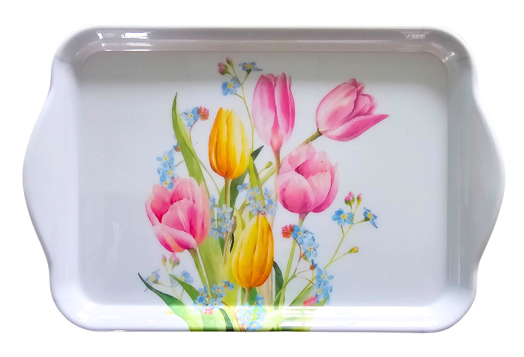 A small tray with a tulip bouquet on it