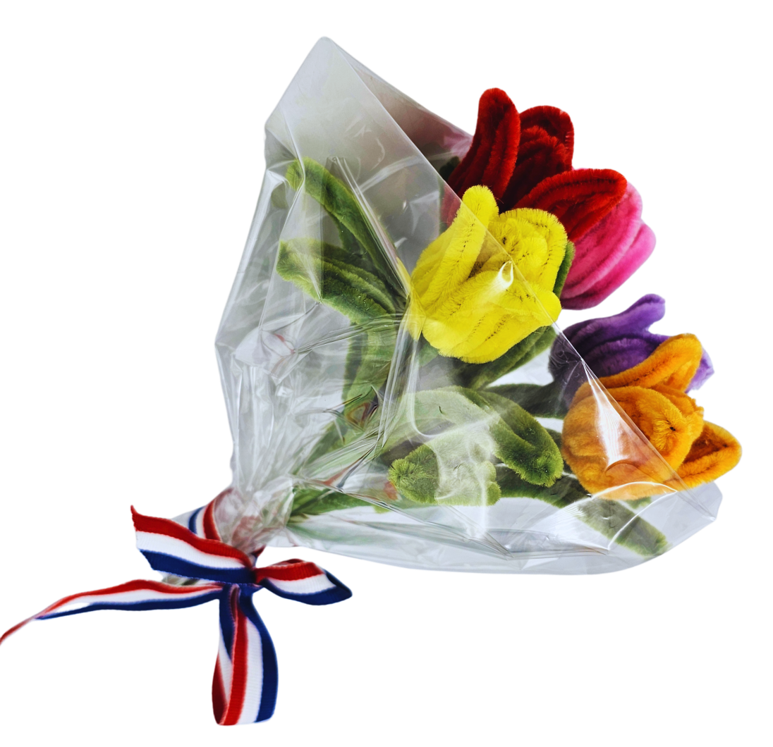The bouquet consists of 5 graceful tulips , carefully wrapped in gift wrap and a Dutch ribbon .