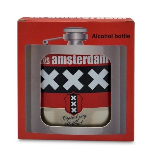 Hip bottle Amsterdam On the bottle as decoration: the three crosses & "Capital City of Amsterdam". This hip bottle is supplied in a cardboard gift box. This small metal hip bottle is ideal for the discreet transport of a ...
