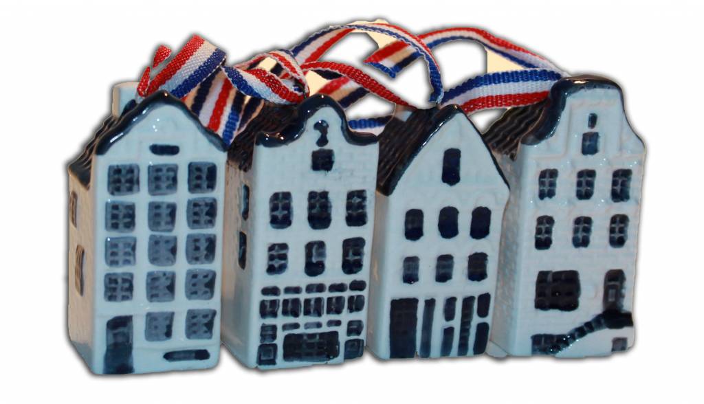 Delft blue gable houses. Set of 4 gable houses. Equipped with Red, White, Blue ribbon. An eye-catcher for your Dutch Christmas tree Size: 2.5 x 2.5 x 5.5 cm • Packed per 4 pieces • In transparent gift box • Hand painted • Dutch ...