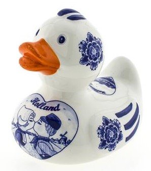A true copy of the rubber duck but now in Delft Blue ceramics
