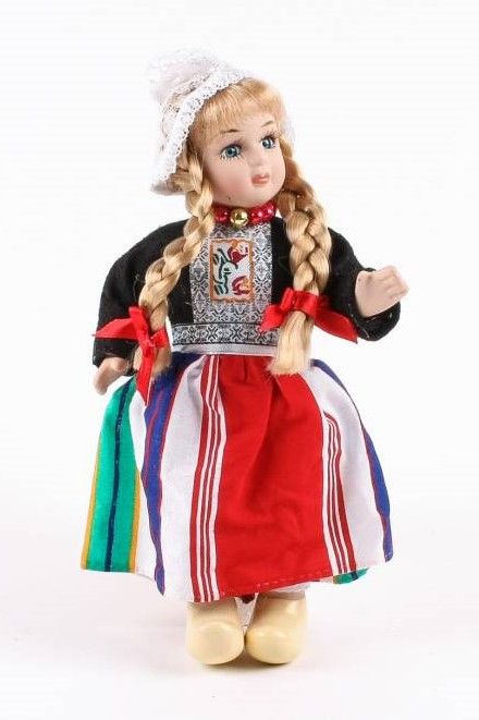 Porcelain doll in Dutch traditional costume, black. With a striped apron. A hand-strung pearl necklace hangs around the doll's neck. And to top it all off, clogs (earthenware) hang on each foot. 20 cm. In a transparent gift box with decoration.