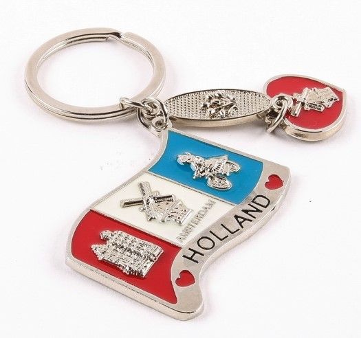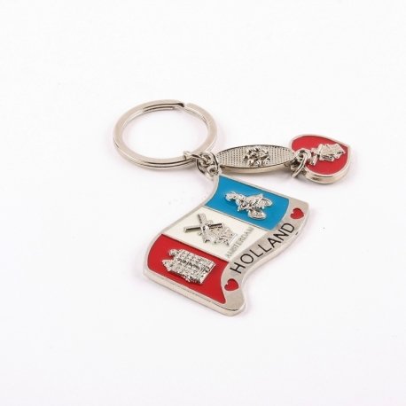 A key ring with the Dutch flag, a heart and icons, with a large, sturdy ring. Decorated with decorations such as windmills, a gabled house, a girl on a bicycle and tulips.