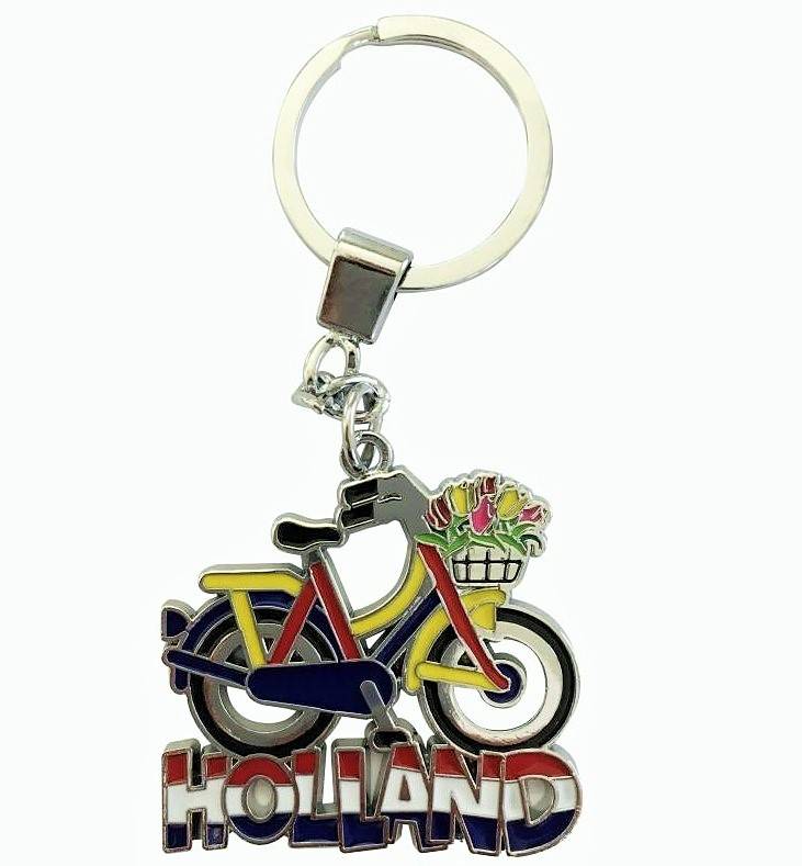 Silver-colored bicycle key chain. On the steering wheel itself a basket with tulips, so typically Dutch At the bottom the text: Holland in Red, White and Blue size: 4.5x4.5 cm