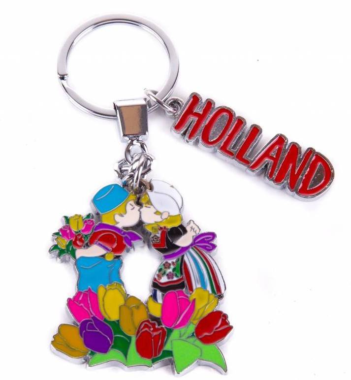 Brightly colored key ring on silver.The well-known kissing couple from HollandImage - Farmer Coupleand an extra charm with the text Holland