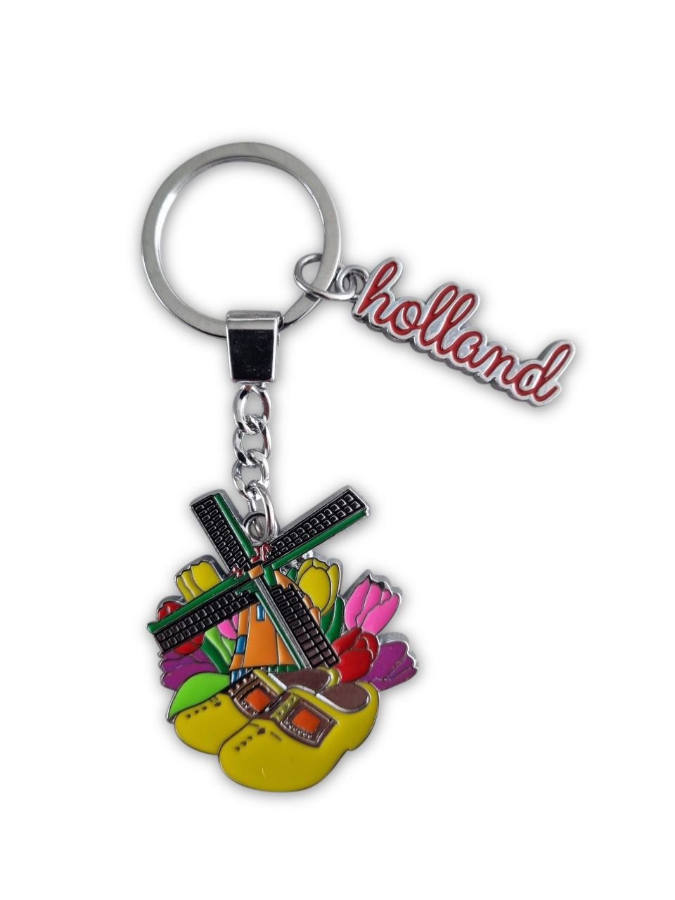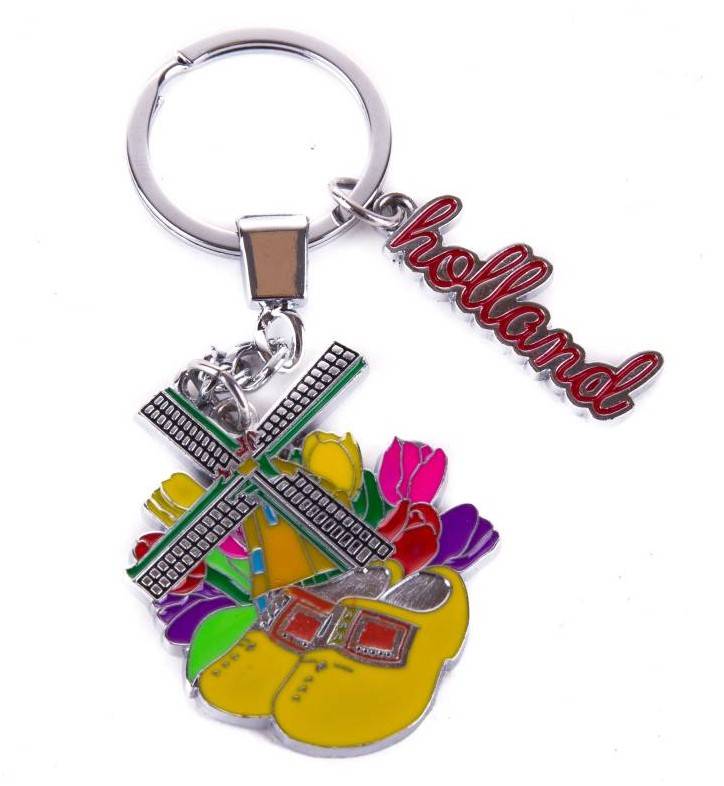 Silver-colored key ring with windmill, clogs and tulips The ring is also provided with a text decoration "Holland" text. The size is: 4x5 cm Solid chain and ring