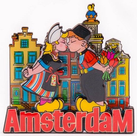 Amsterdam Magnet - Kissing Couple. A cheerfully colored magnet featuring a kissing couple in Amsterdam, with the characteristic gabled houses and the Westertoren tower in the background. Made of MDF with a glossy coating. Image: a kissing couple in Amster