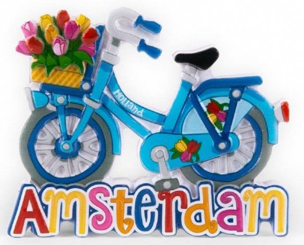 Magnet Amsterdam - Blue bicycle Cheerful colored magnet bicycle with basket of flowers • At the bottom of the text: Amsterdam • Made of polystone. • Size: 6x6 cm