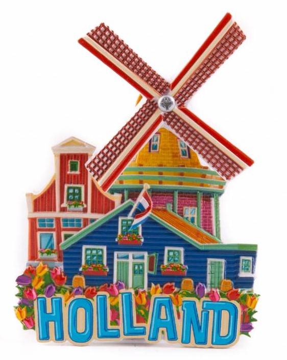 Magnet Hollandse Molen Particularly colorful magnet. Mill with really rotating blades. • Made of polystone. • Size 6x8 cm • Text: Holland