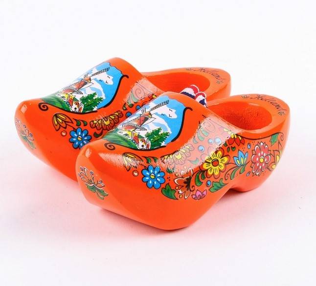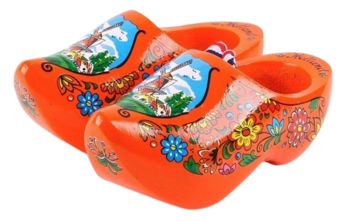 Orange clogs 10 cm Beautifully decorated wooden clogs. Decorated with flowers and a mill view. The clogs have Red, White, Blue ribbon.