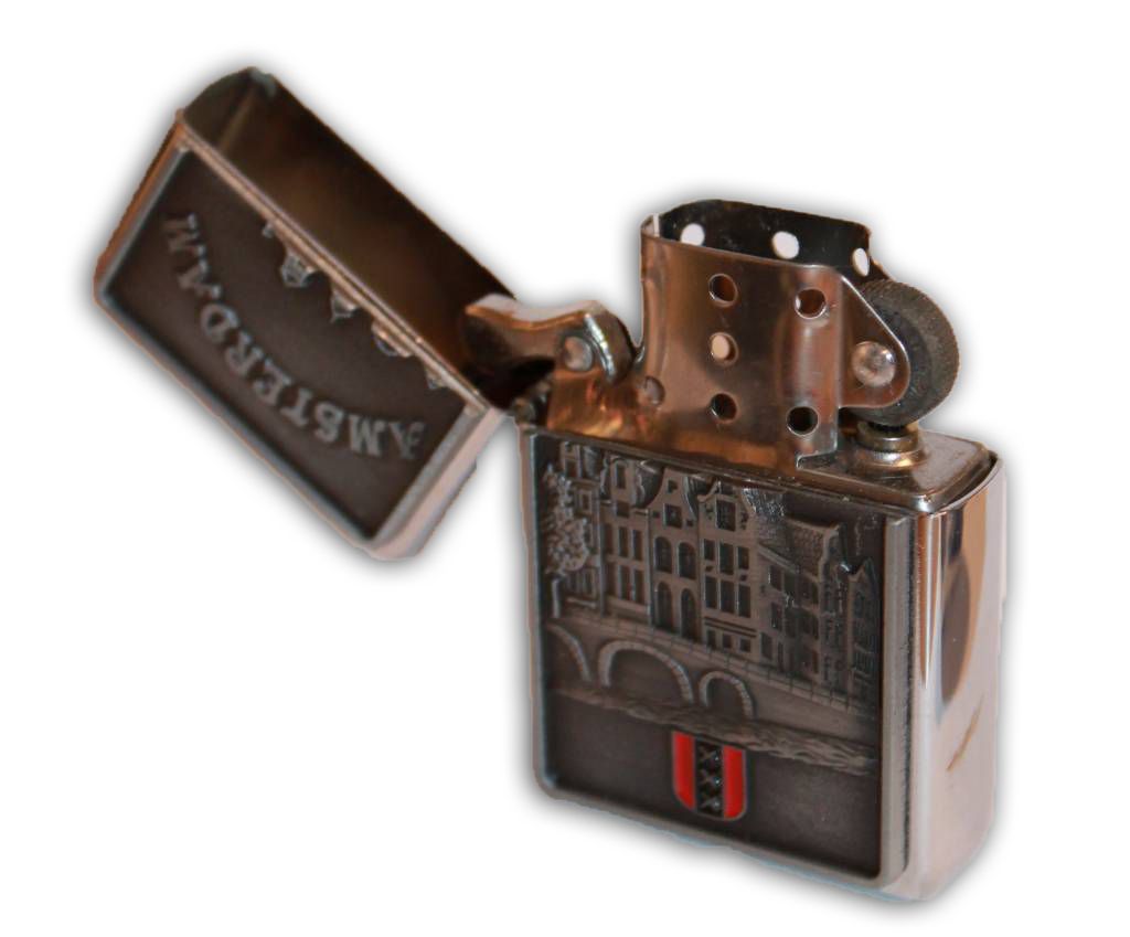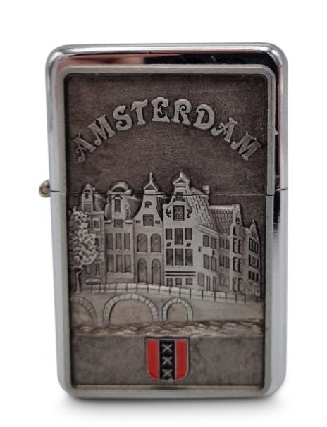Zipper Petrol Lighter This lighter is a beautiful petrol lighter. This Nickel lighter has a beautiful relief - Facade Houses Text: Amsterdam By closing the flap, the flame will also go out neatly.