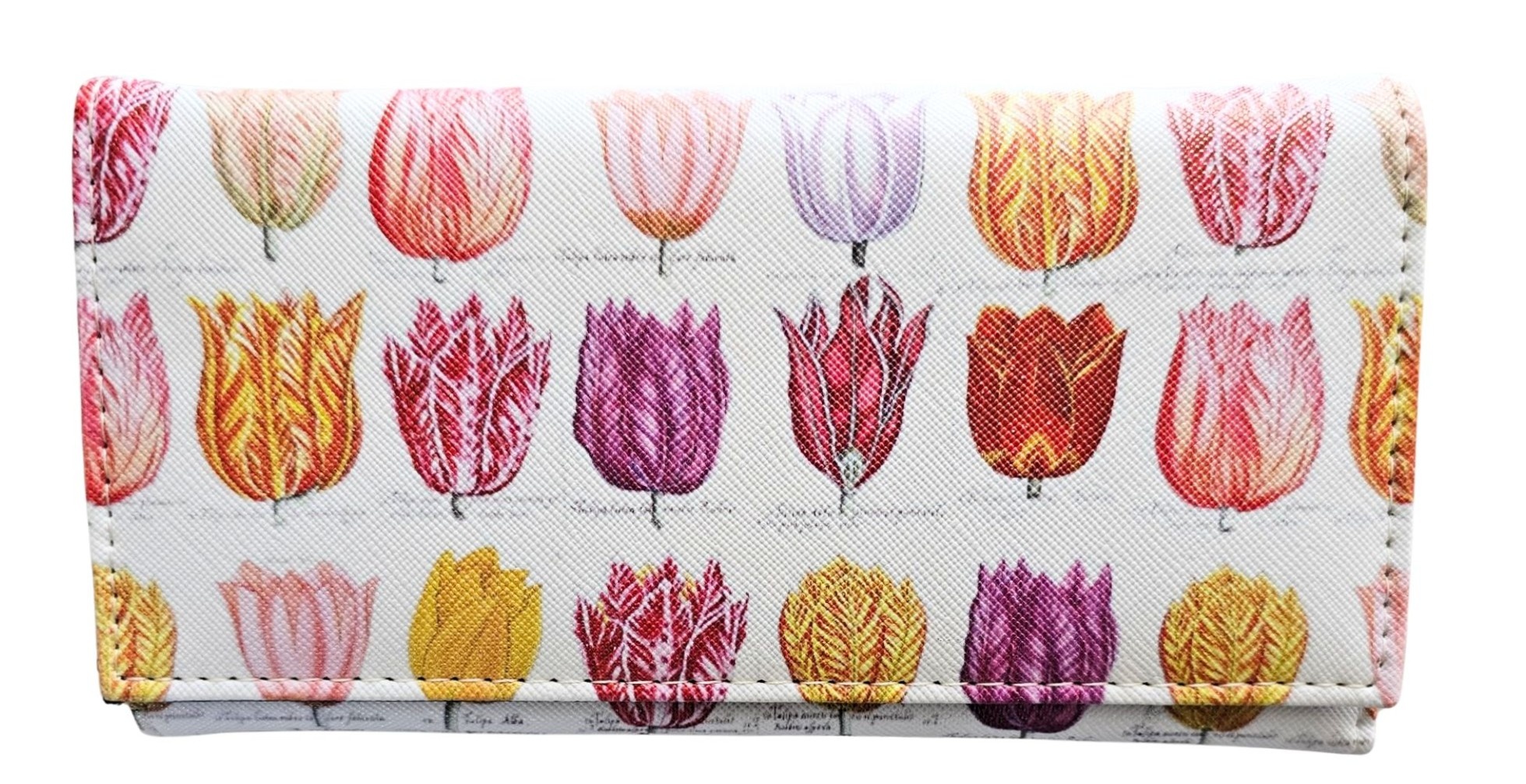 Stylish ladies' wallet in crisp white, decorated with cheerful, multicolored tulips. This spacious 19x10 cm wallet closes conveniently with a magnetic snap and offers plenty of room for all your cards, banknotes, and coins. A colorful Dutch item!