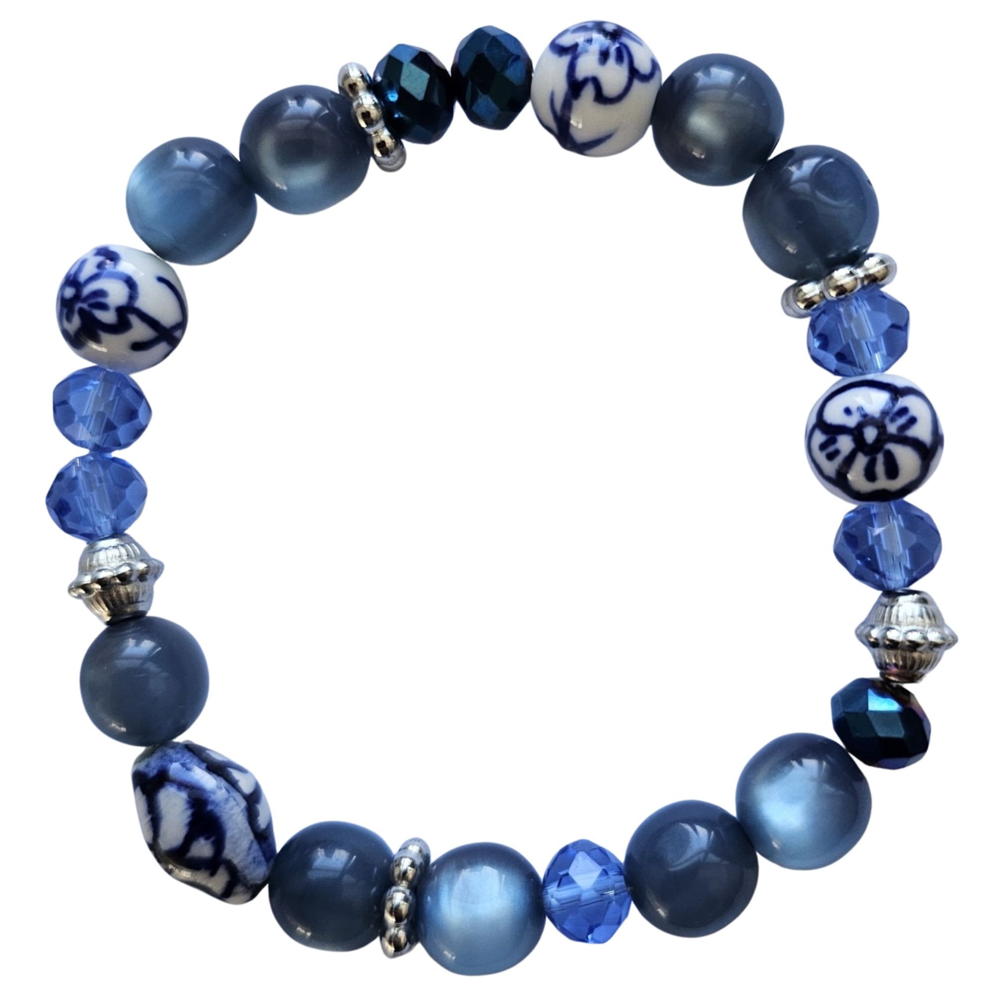Stijlvolle armband met een mix van lichte en donkerblauwe kralen, zilveren details en parelmoerglans. Bevat handgeschilderde Delfts blauwe kralen en een sierlijk zilveren schijfje. Dankzij het elastiek is deze armband van 8 cm comfortabel en passend.