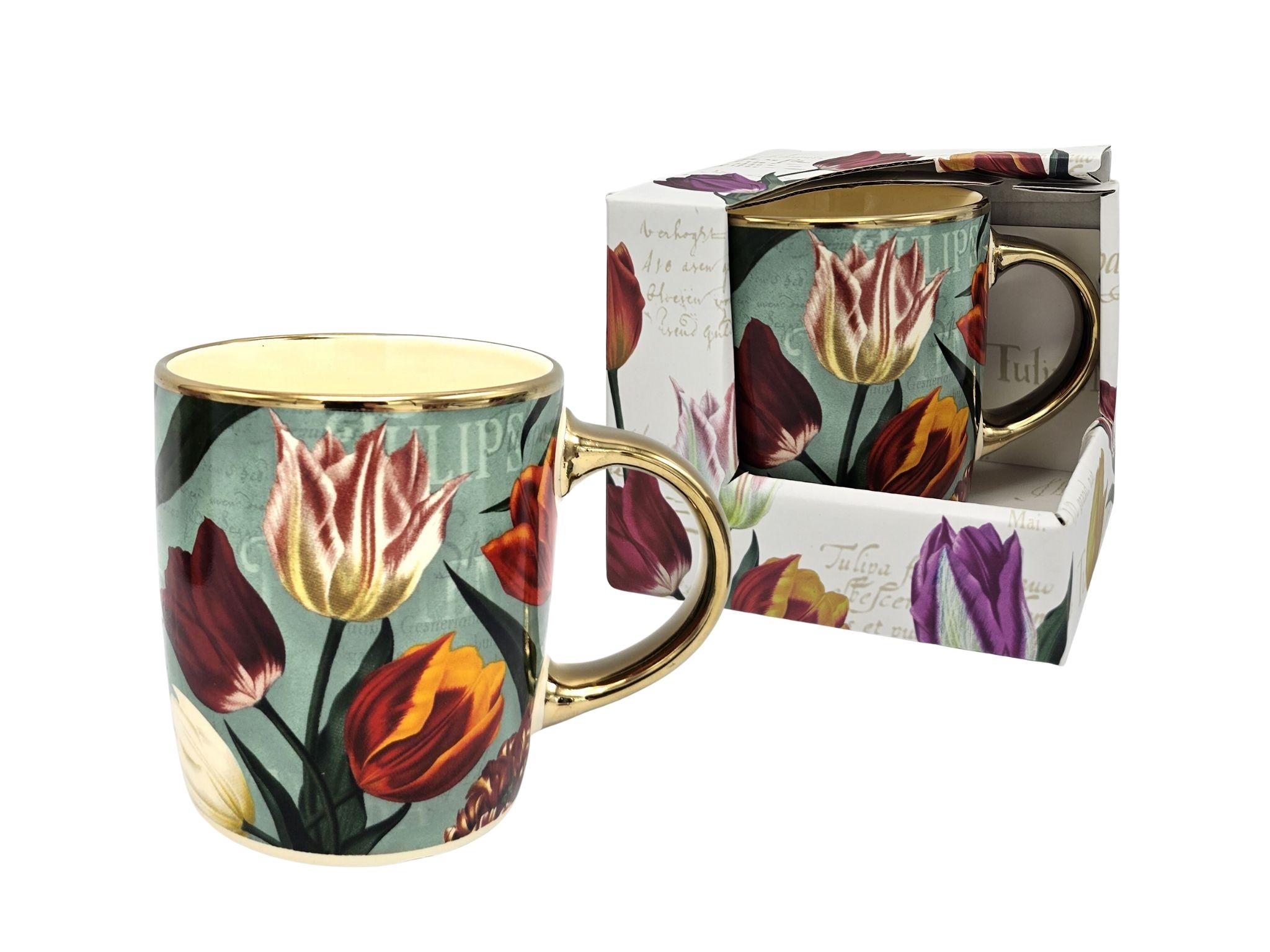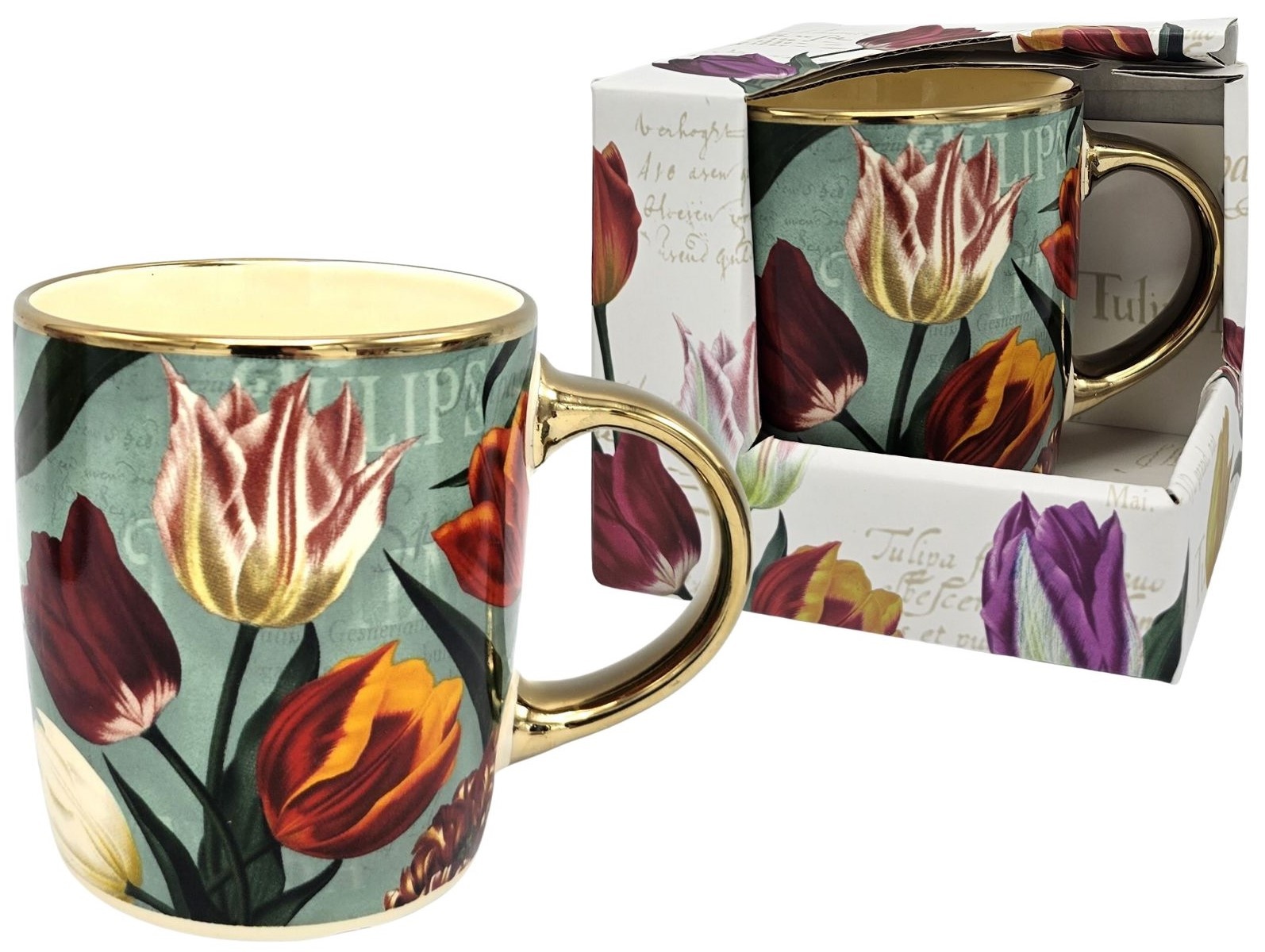 De grote mok met gouden oor in een eveneens een stijlvolle geschenkdoos.