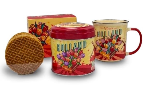 Stroopwafels in blik met bijpassende mok.Samen verpakt in een vacuuseal