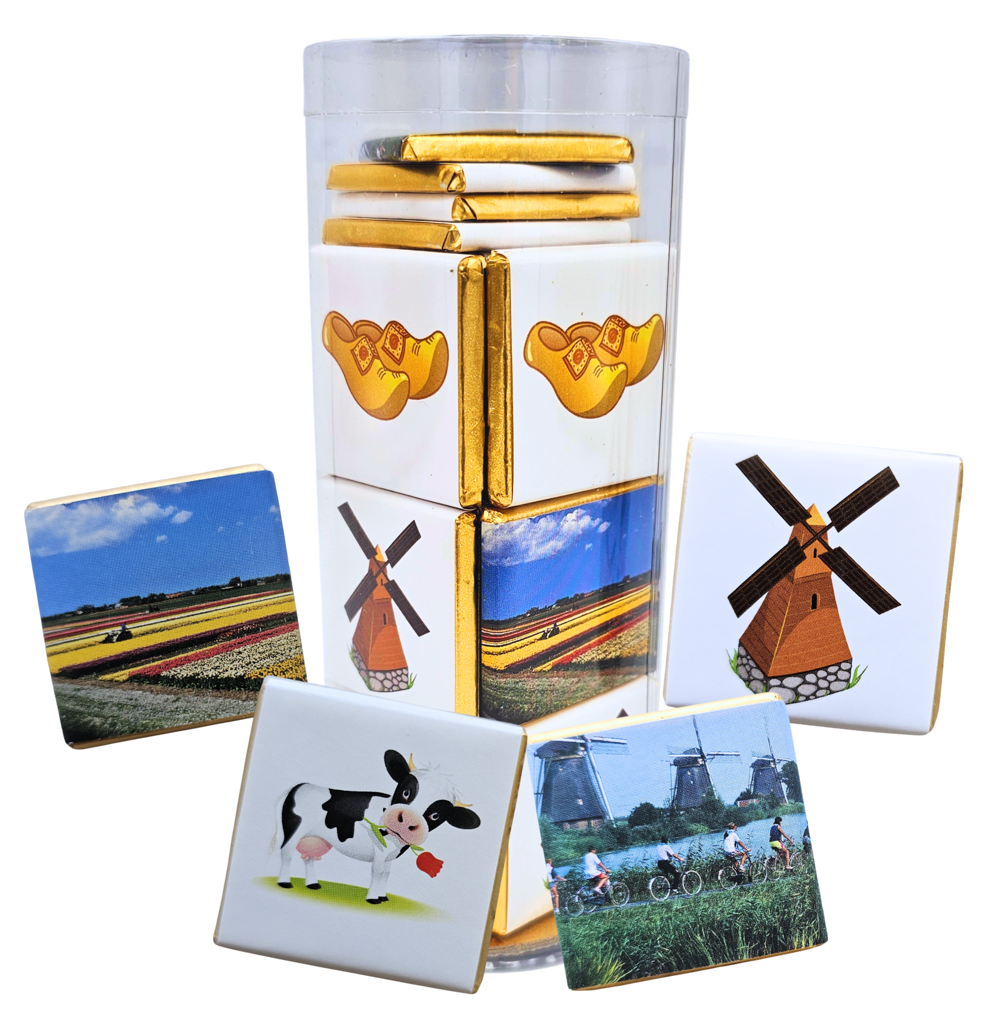 Geinige Hollandse afbeeldingen: Elk chocolaatje is voorzien van iconische en grappige Hollandse afbeeldingen, wat een glimlach op het gezicht van elke ontvanger zal toveren.