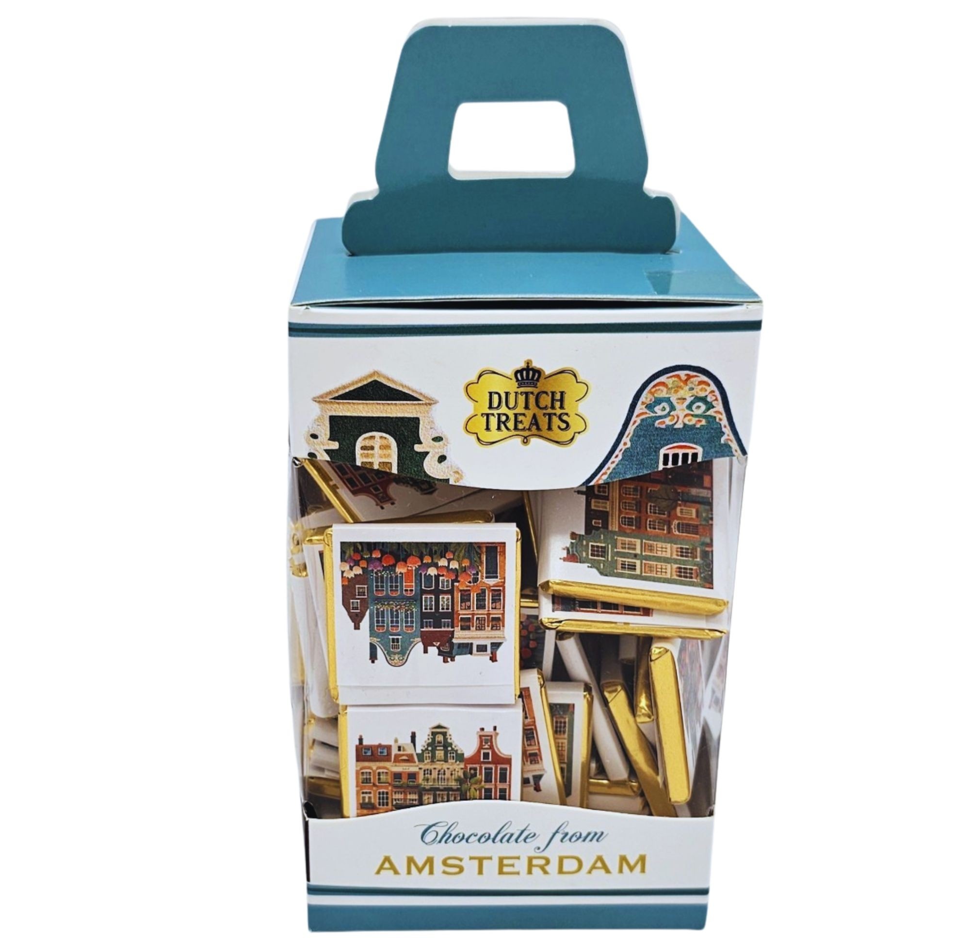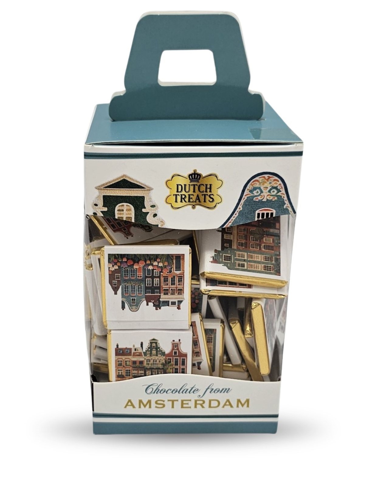 Geinige Amsterdam afbeeldingen: Elk chocolaatje is voorzien van iconische Amsterdam huizen, wat een glimlach op het gezicht van elke ontvanger zal toveren.