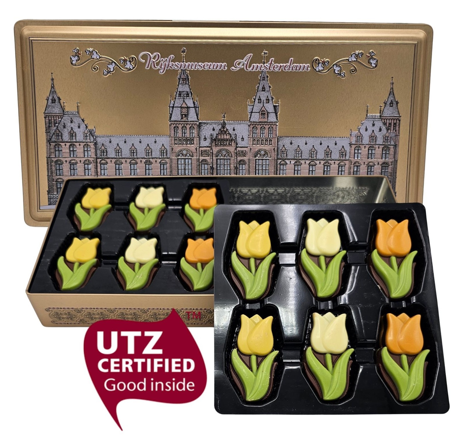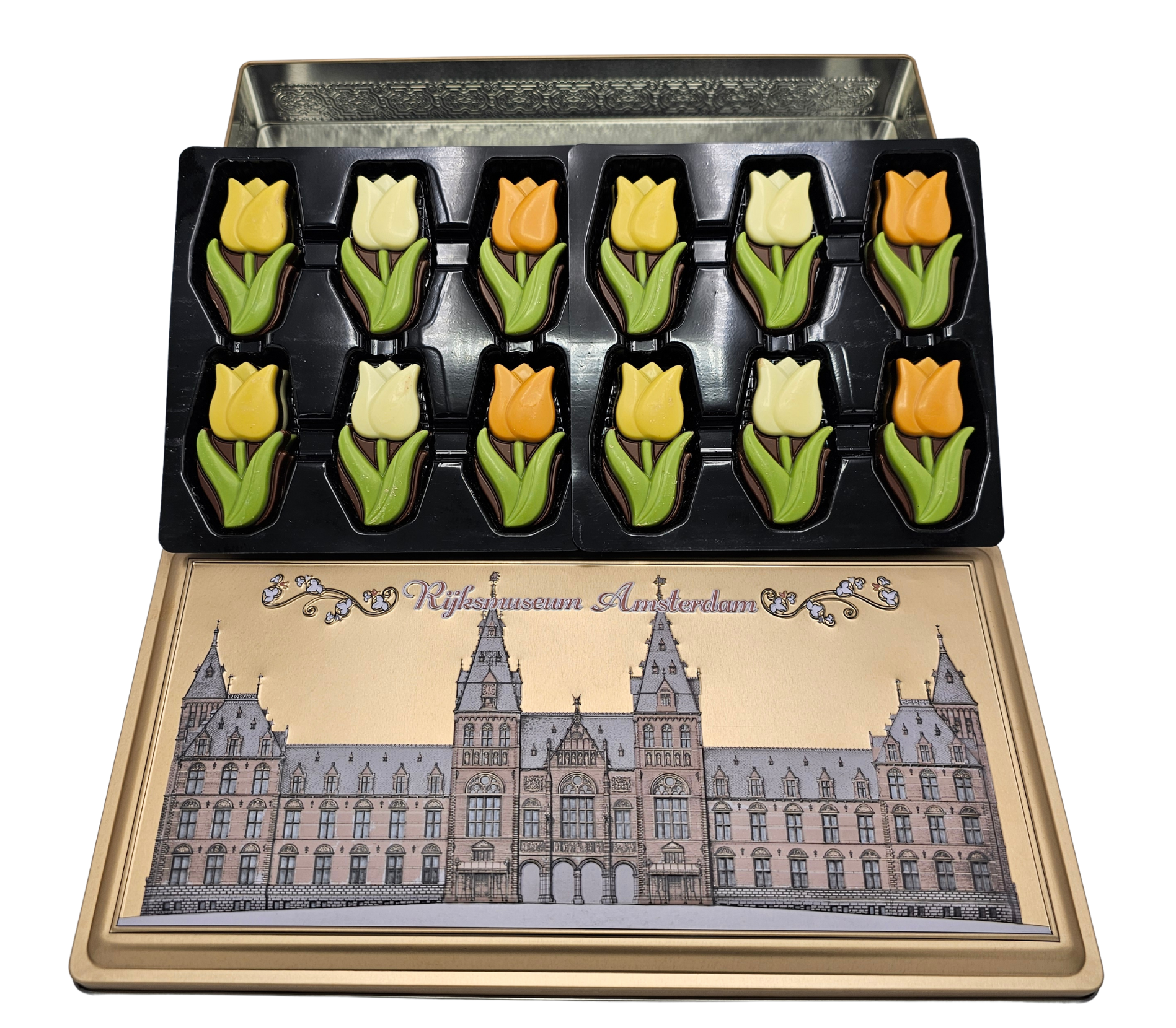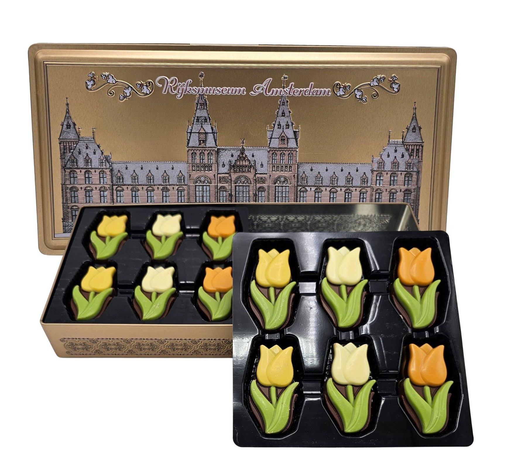 Een bijzonder stijlvol geschenkblik met heerlijk melkchocoladetulpen.