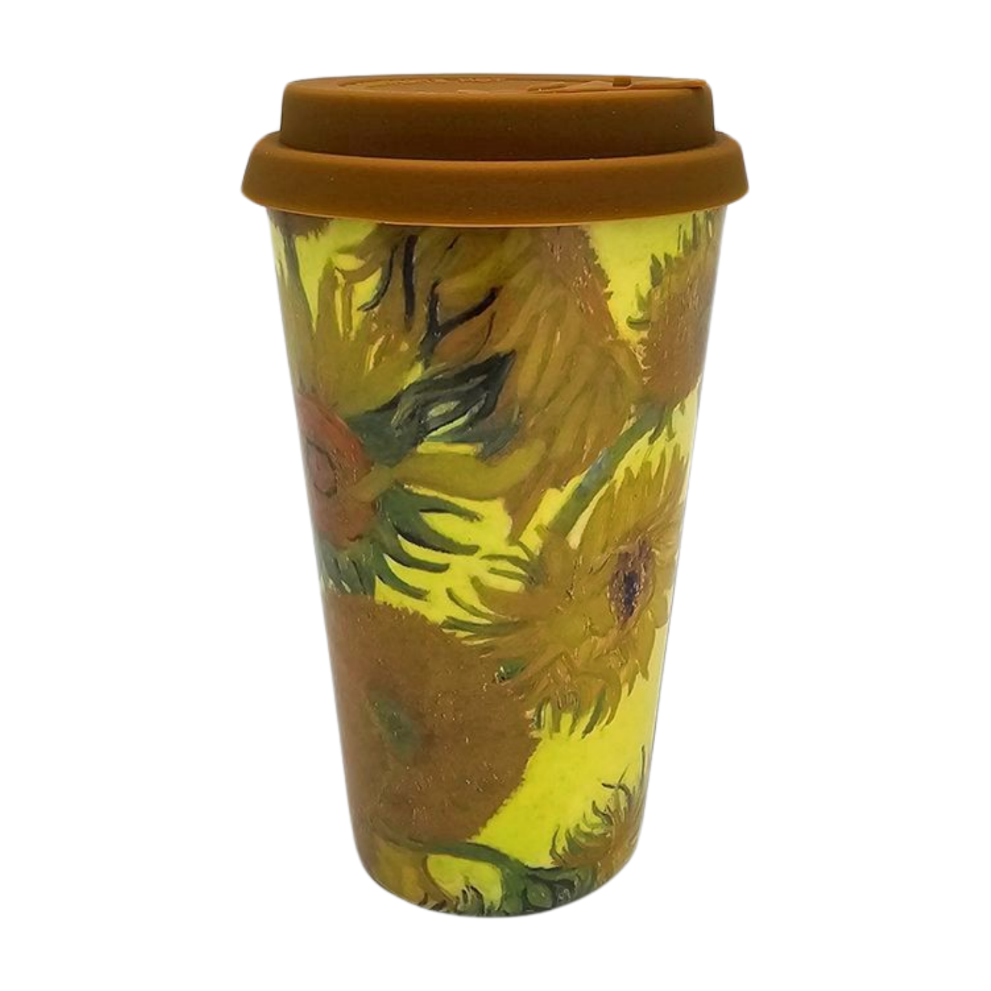 Coffee to Go beker - Zonnebloemen (travelmug) Fraai gedecoreerd met de Zonnebloemen van Vincent van Gogh Weg met plastic bekers. Use en re-use
