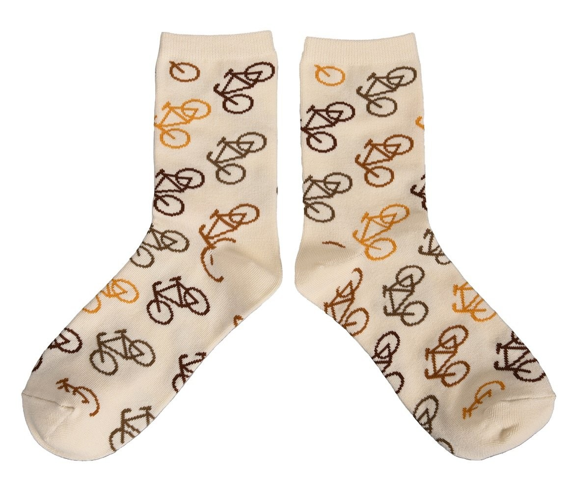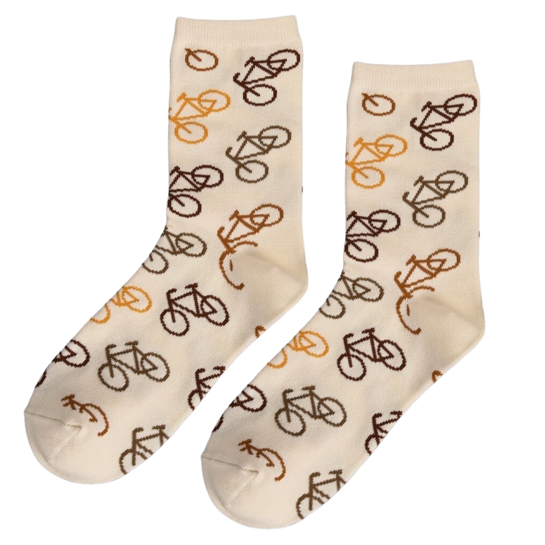 Trendy doch klassieke beige sokken met fietsen in bruin en oker fietsen